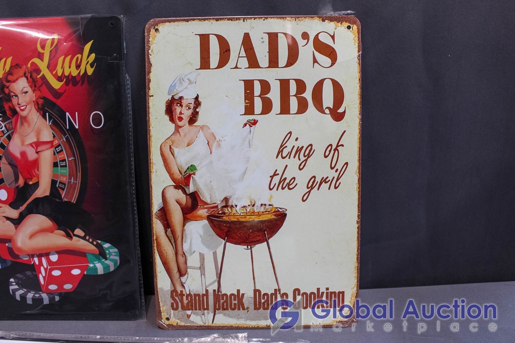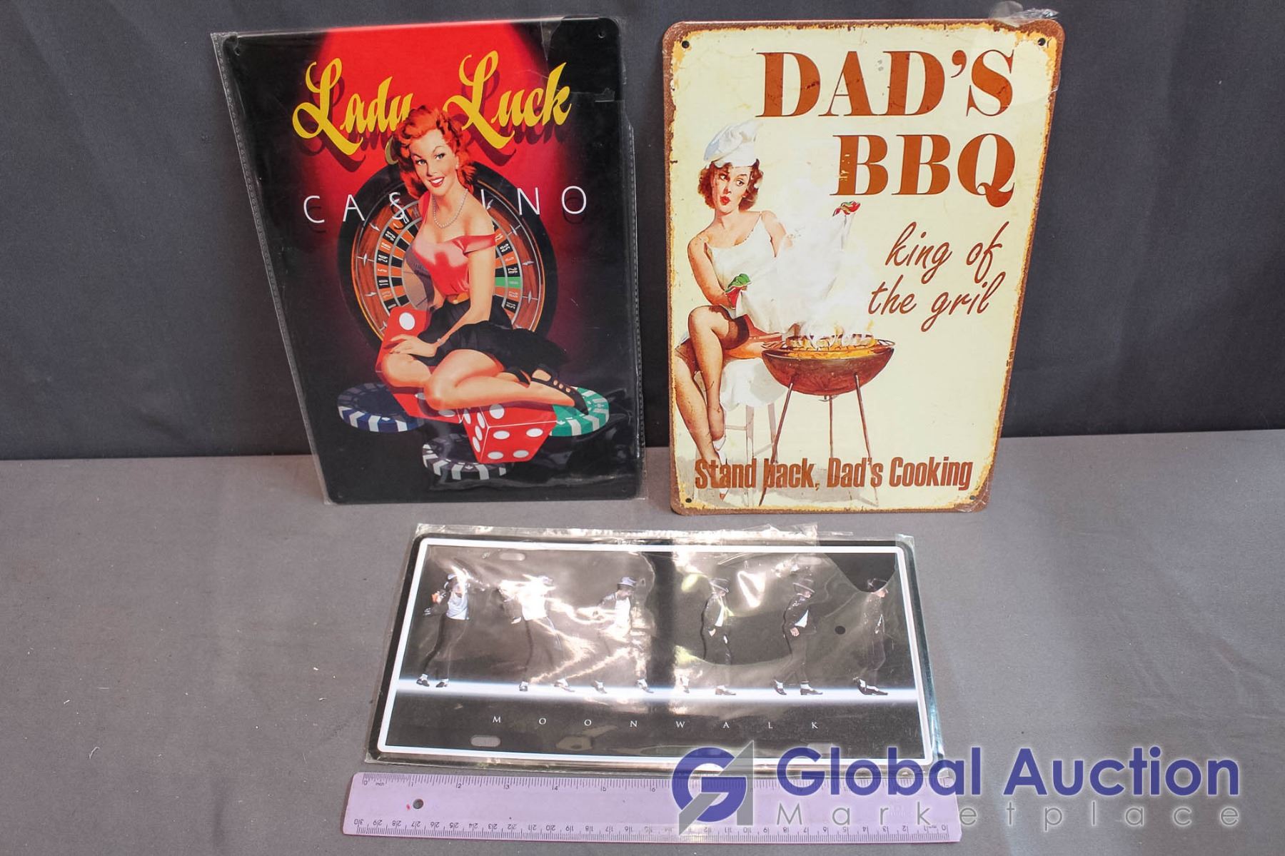 Tin Signs (Lady Luck & Dad's BBQ) & Micheal Jackson Moonwalk License Plate