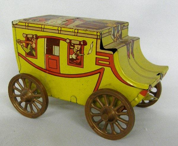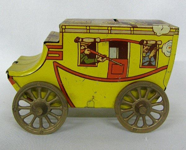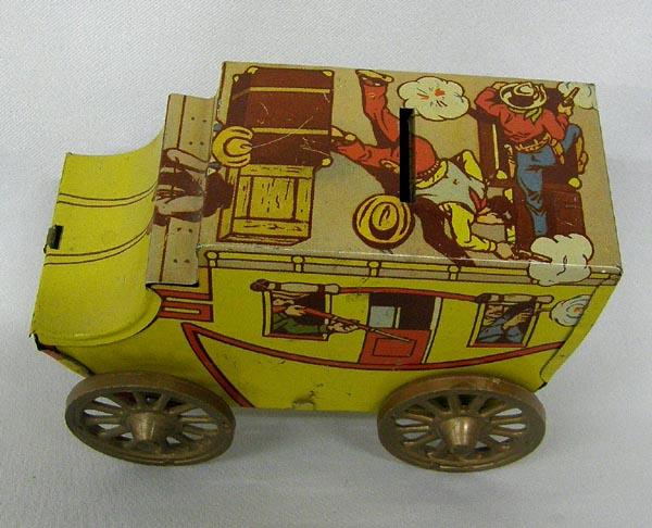 Tin Stagecoach Bank. Measures approx. 3''Hx4.75''Lx3''W. Buyers Pay Actual Shipping and Handling Charges(see terms and conditions for more information).