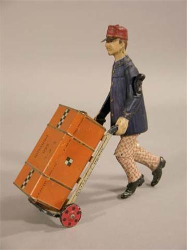 Tin Toy - German made - Bellman hauling luggage on dolly, 1906 patent, England, 8" tall, ex. cond.