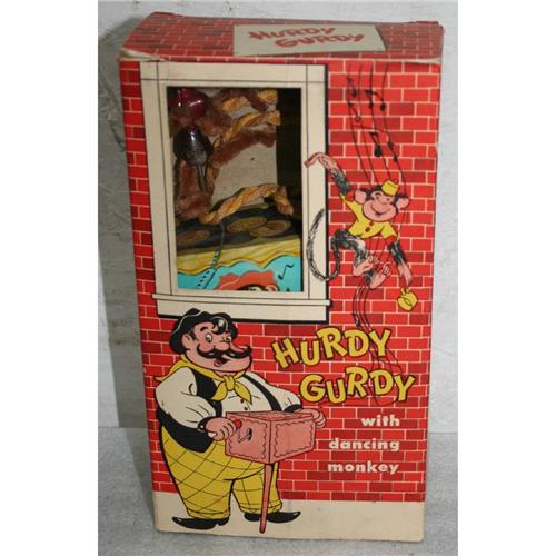 Toy Hurdy Gurdy.  Tin.  Monkey on top bobs when handle is turned.  Toy measures approx. 5 ½" x 4 “ x 2" plus 3 3/4" monkey .  Original Box.  Mattel Creations 1951.  Song: Carnival in Venice.