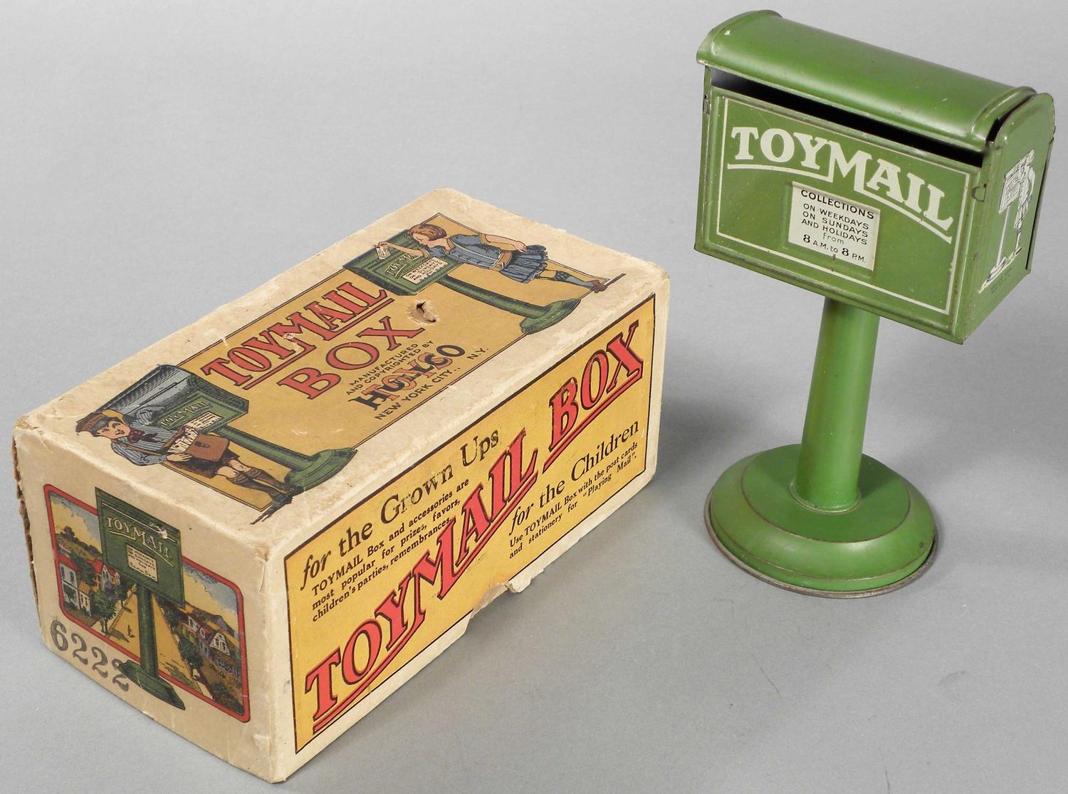 Tin Toy Mail Box in original box. Hullco Toys, NYC. Mail box only, does not come with any accessories. Box has punched hole in lid, Mail Box in near mint condition, 6 inches tall. Start Price $50