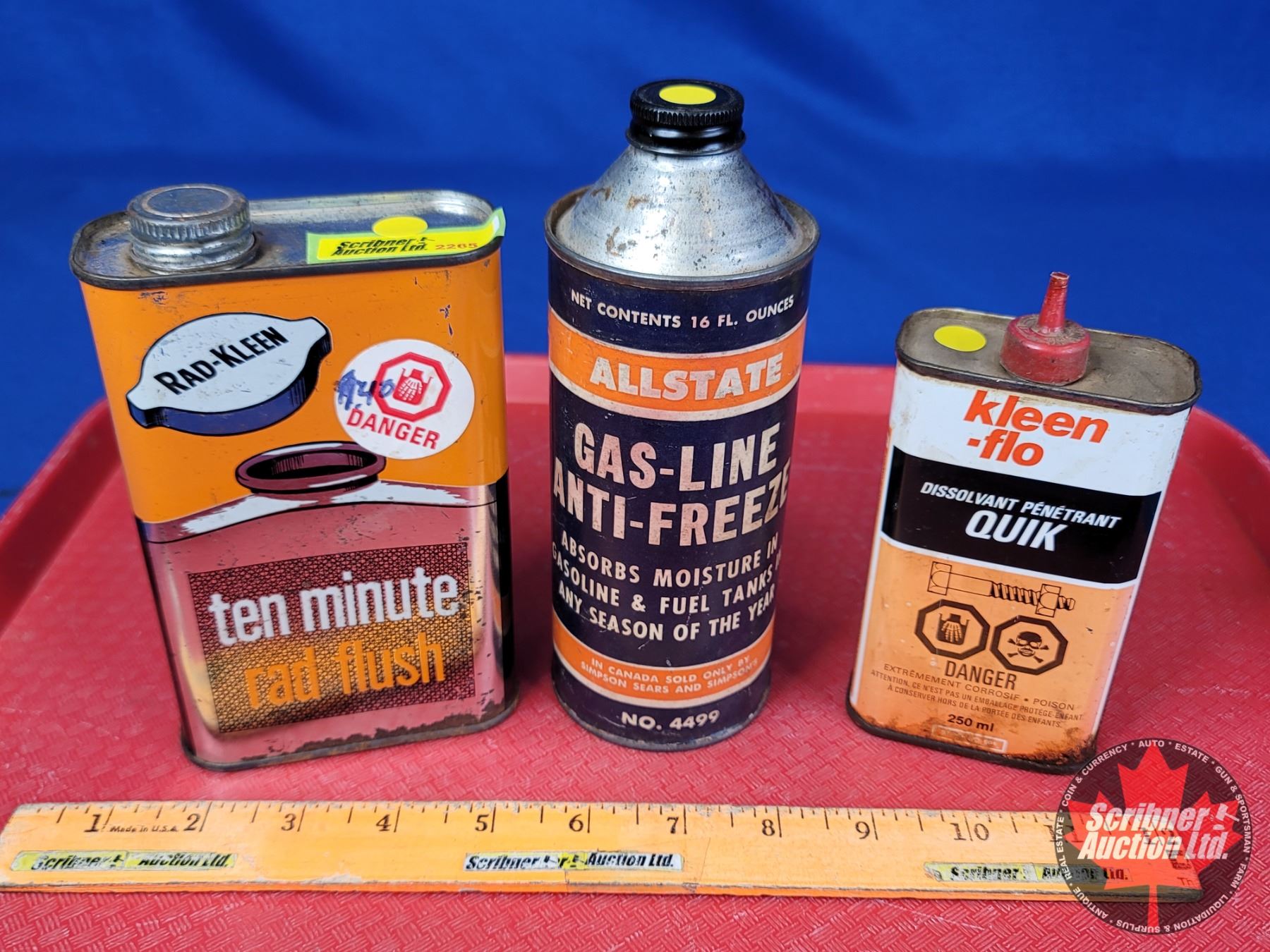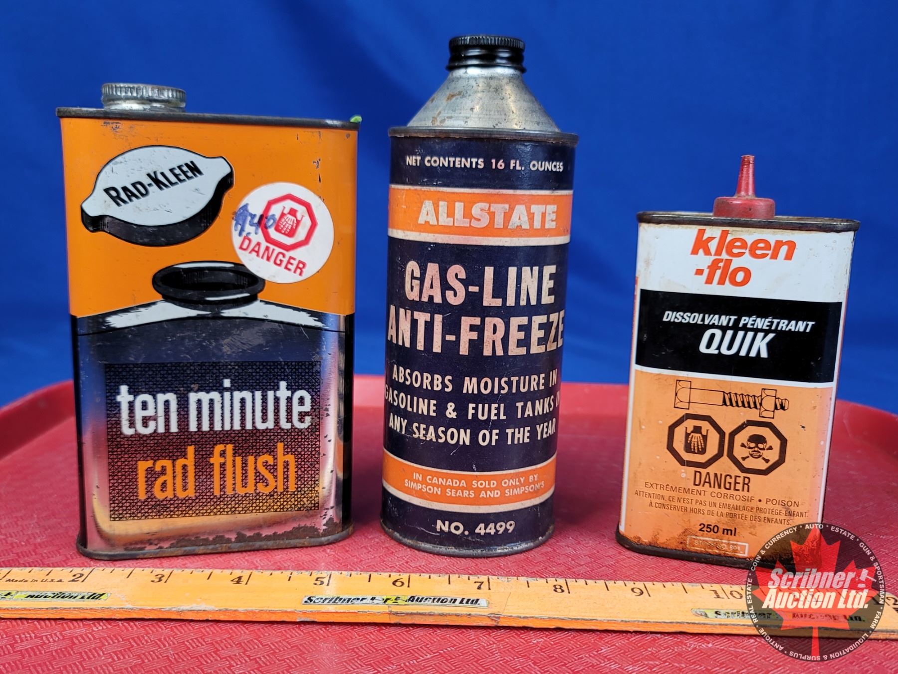 Tin Trio : Rad-Kleen Rad Flush, Allstate Gas-Lin Anti-Freeze (Paper Label) & Kleen-flo Penetrating Solvent (Largest Measures : 7"H) (SEE PICS!)