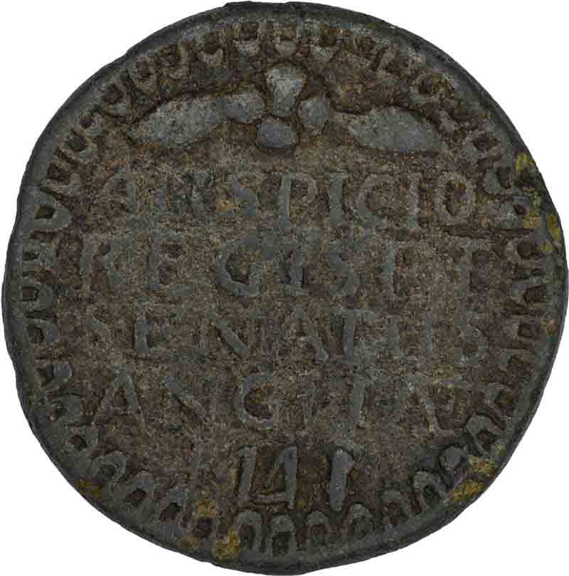 Bombay Presidency, Tin 2 Pice, Obv: GR above a large crown divided by an orb and cross with BOMB written below, Rev: the company motto with ornaments, a rim border of half loops and legend AUSFICIO/ REGI SET/ SENATUS/ ANGLIAE with date 1741 below, issue of 1717-1771, 26.05g, 41.54mm, (Prid 233, KM 157.1), aboutfine, Very Rare.