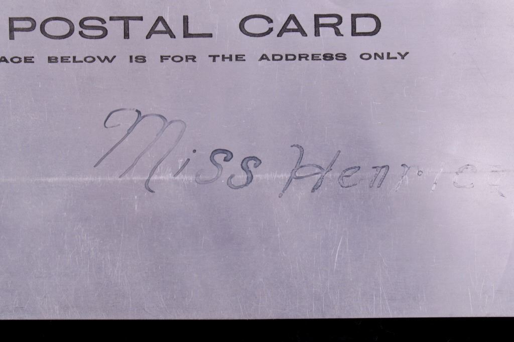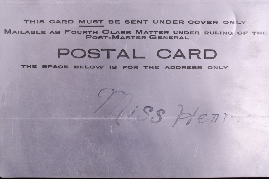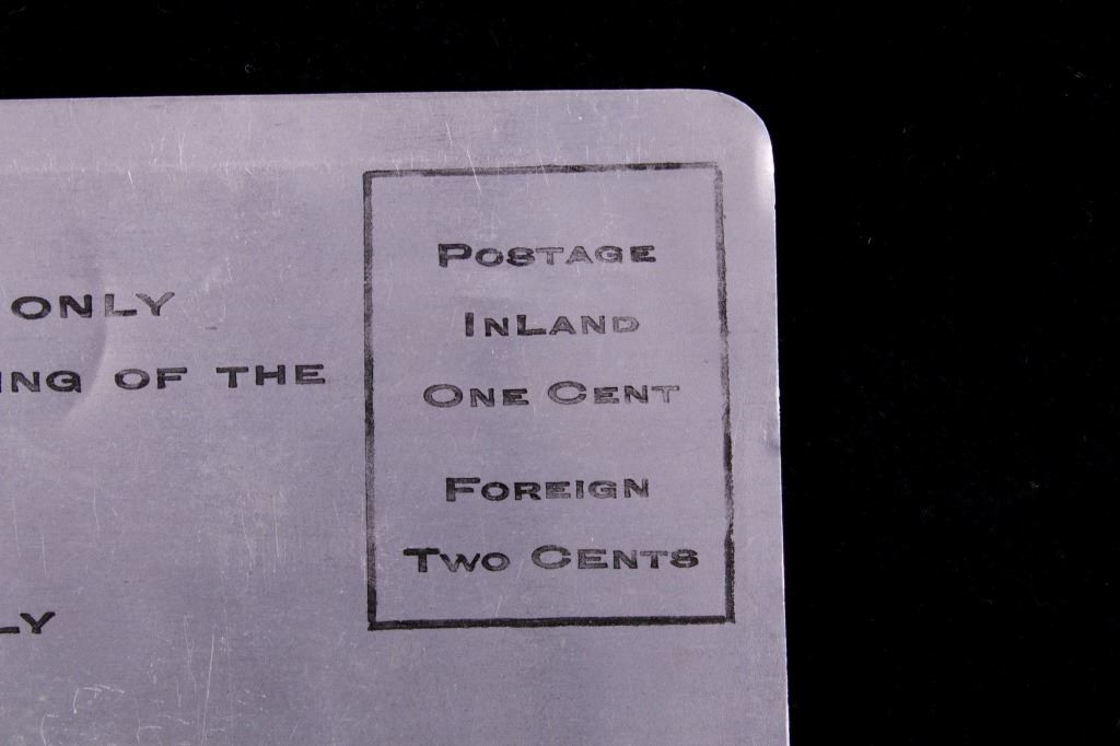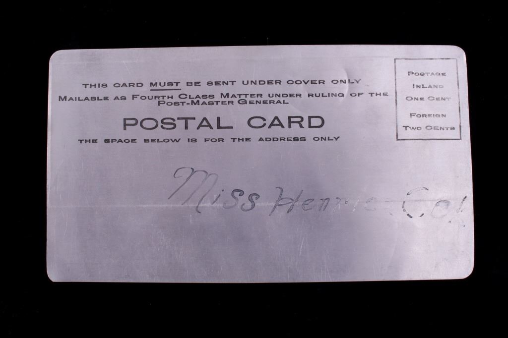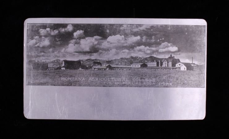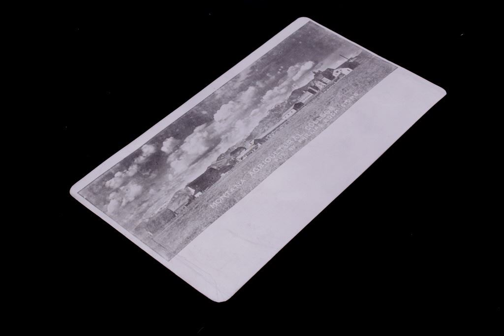 For your consideration is a rare tin-type photograph, aluminum postcard of Montana Agricultural College, published by Philips Book Store in Bozeman, MT. The Montana Agricultural College was founded in 1893 and Philips Book Store was opened in 1897 by Sherman Phillips and A.M Ryan, who had been president of the university. Phillips Book Store was open on Main Street in Bozeman for 115 years. Montana Agricultural Collage became Montana State University (MSU) in 1965. The postcard is made of a thin sheet of aluminum with the photograph of the college tin-typed onto it. The photo shows the buildings in great detail. On the back is where the address and postage would go. The post card is in good condition for its age of over 120 years, with some minor scratches. On the back of the postcard is written “Miss Henrica Cok”. The postcard measures 5 3/8" X 3". This is a very rare and unique piece of Bozeman and Montana history.