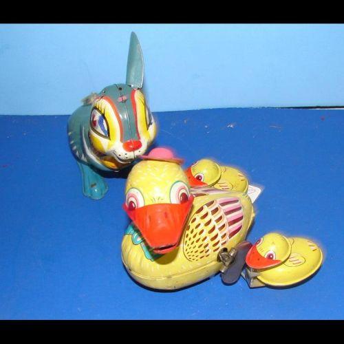 Tin Wind Up Duck & Ducklings & Bunny Tin Wind up Duck & Ducklings and wind up Bunny (missing one ear).