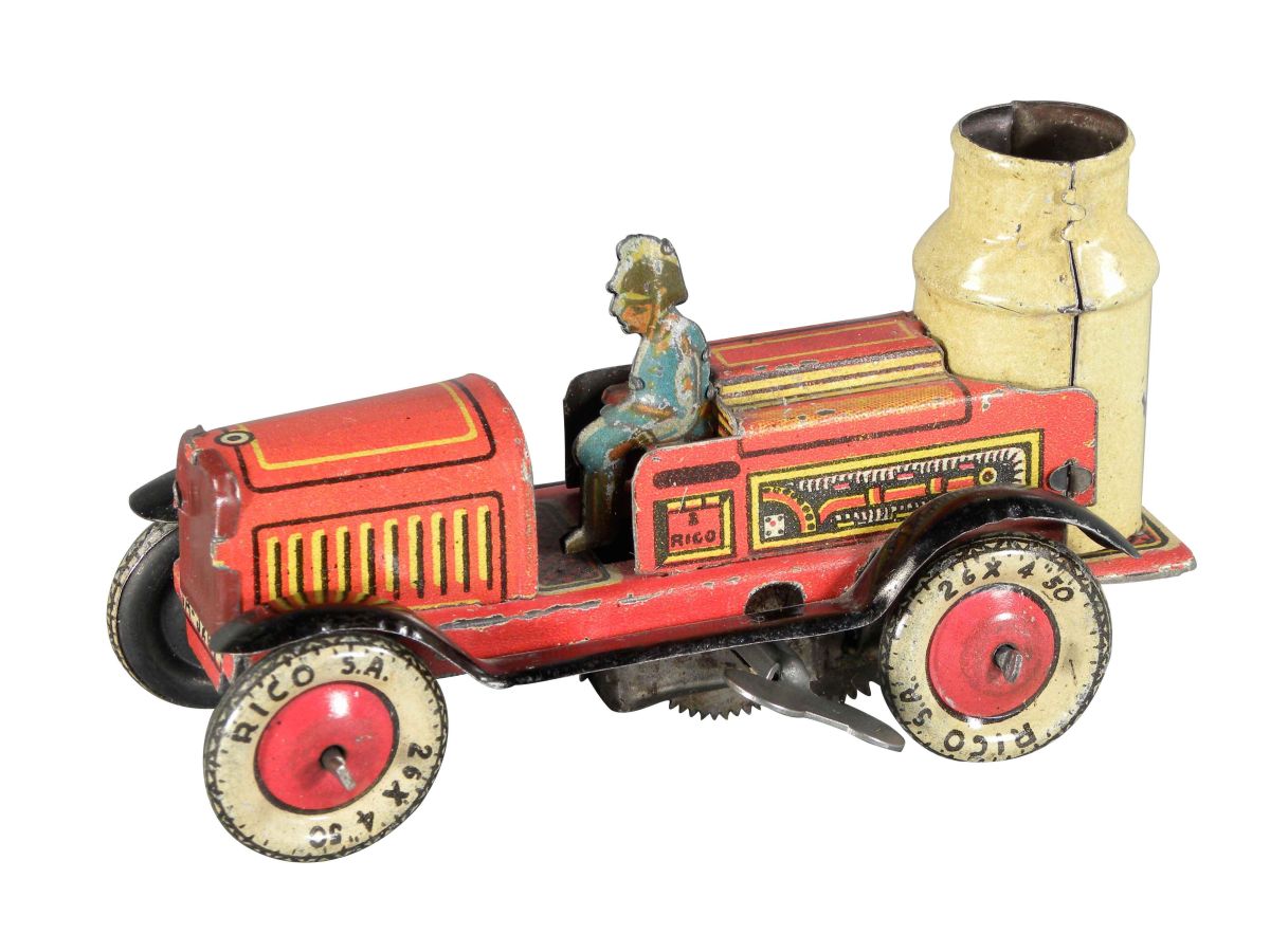 Tin Wind Up Fire Steam Pumper Toy, with key. Rico Spanish. Some minor scratches otherwise excellent condition. 4 1/2 inches long.