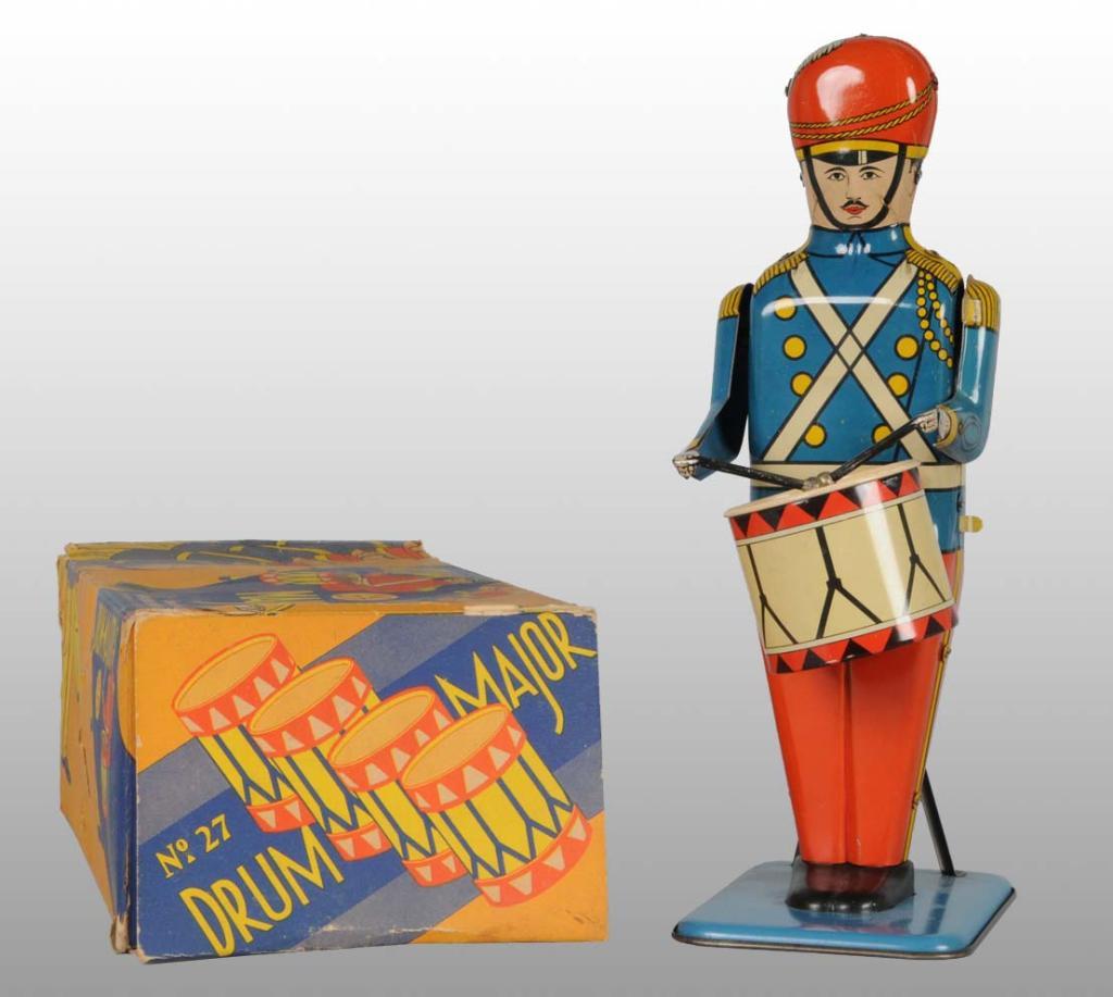 Description Made by Wolverine Supply and Manufacturing Company. Working. Lithography on toy is bright and shiny with very little wear and replaced drum head. Includes original box marked "# 27" with moderate tearing, creasing and replaced top flap. Condition (Very Good). Size 14" T.