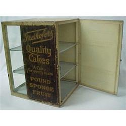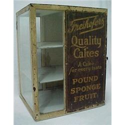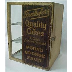 Tin advertising cake display cabinet, Freihofer's Quality Cakes, A Cake for every taste, Pound Sponge Fruit, removeable interior enameled metal shelves, measures 22" high x 14 1/2" x 14 1/2", lettering on two sides, some rusting, early 20th C. Estimate 200/400