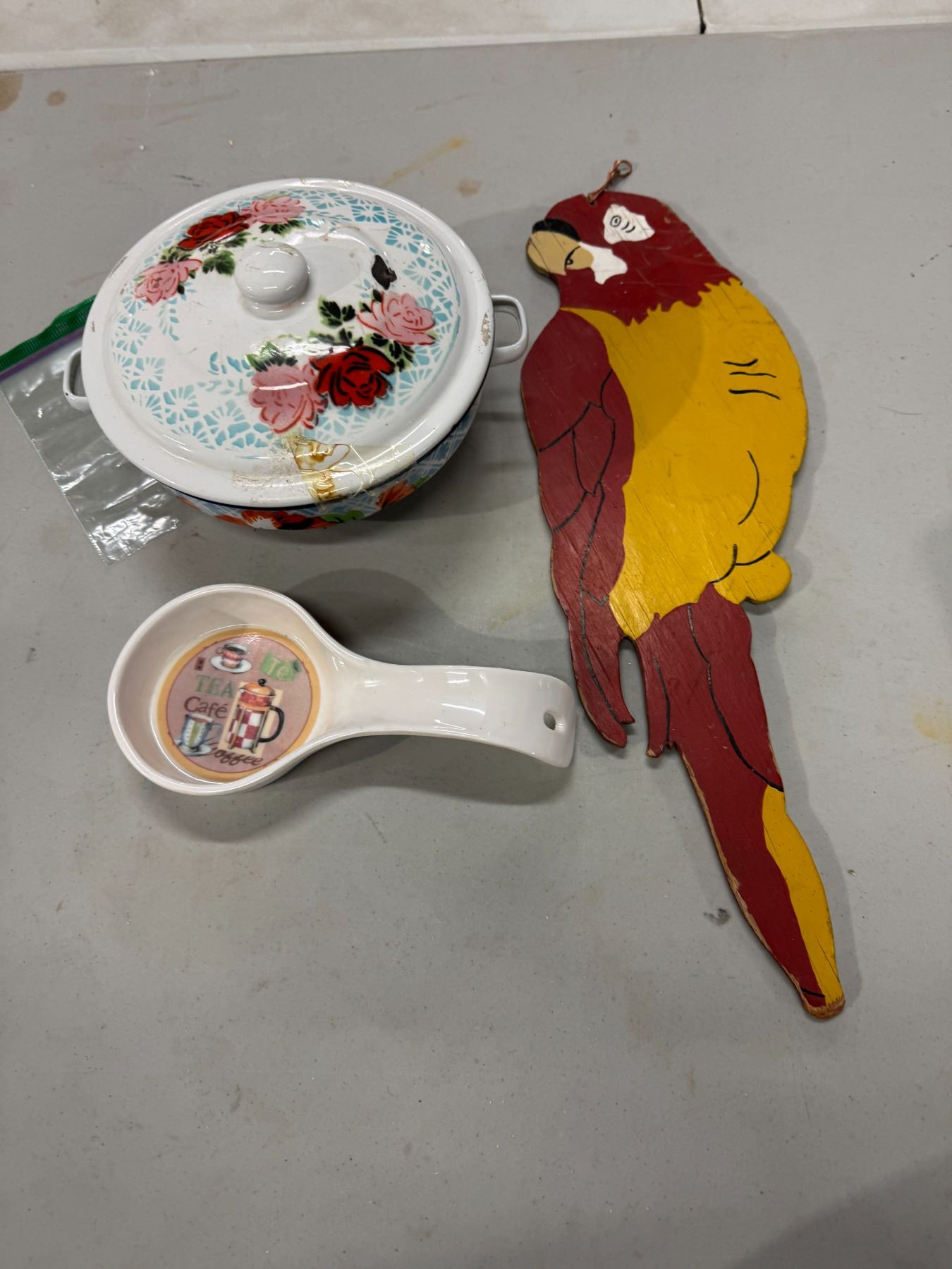 Tin enamel pot, parrot and spoon rest
