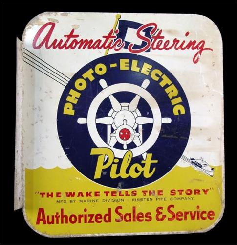 Tin flange sign, "Photo Electric Pilot Steering Mech" 18 x 19 "