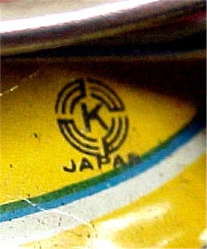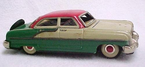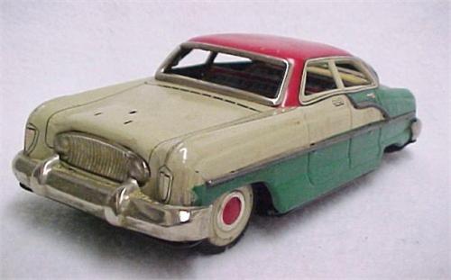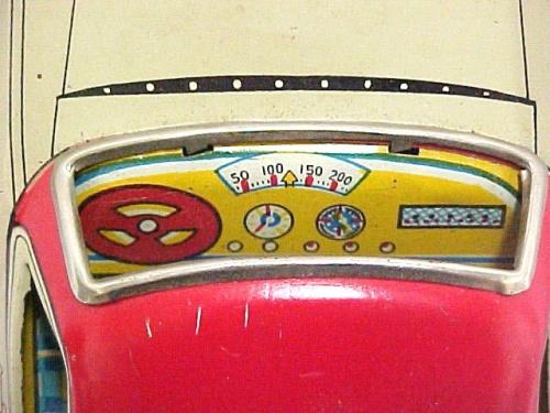 Tin friction car; white red & green with detailed dashboard; spare tire on trunk; K Japan, 8", missing hood ornament & minor scratches to paint on hood;