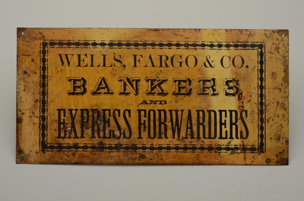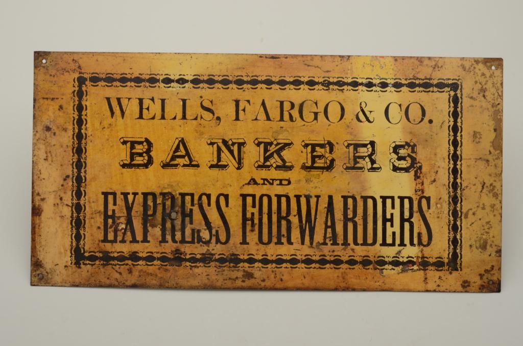 Tin sign which reads, “Wells ,Fargo and Co., Bankers and Express Forwarders”. Hand-painted with stencil showing age. The sign is rusty with a bullet hole. Measures approximately 12” x 24”. Est.: $150-$300