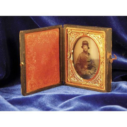 Tin type of US Calvary Soldier in Leather Case. Photo excellent condition, case shows some wear on outside. 2 1/2 X 3 inches.