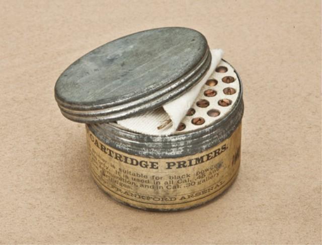 Tin with label marked 500 Cartridge Primers and Primers suitable for .45 and shotgun ammunition and 30 gallery practice cartridges. Manufactured Frankford Arsenal, full label, primers all intact. An unusual military accessory. Est: $300 - $600