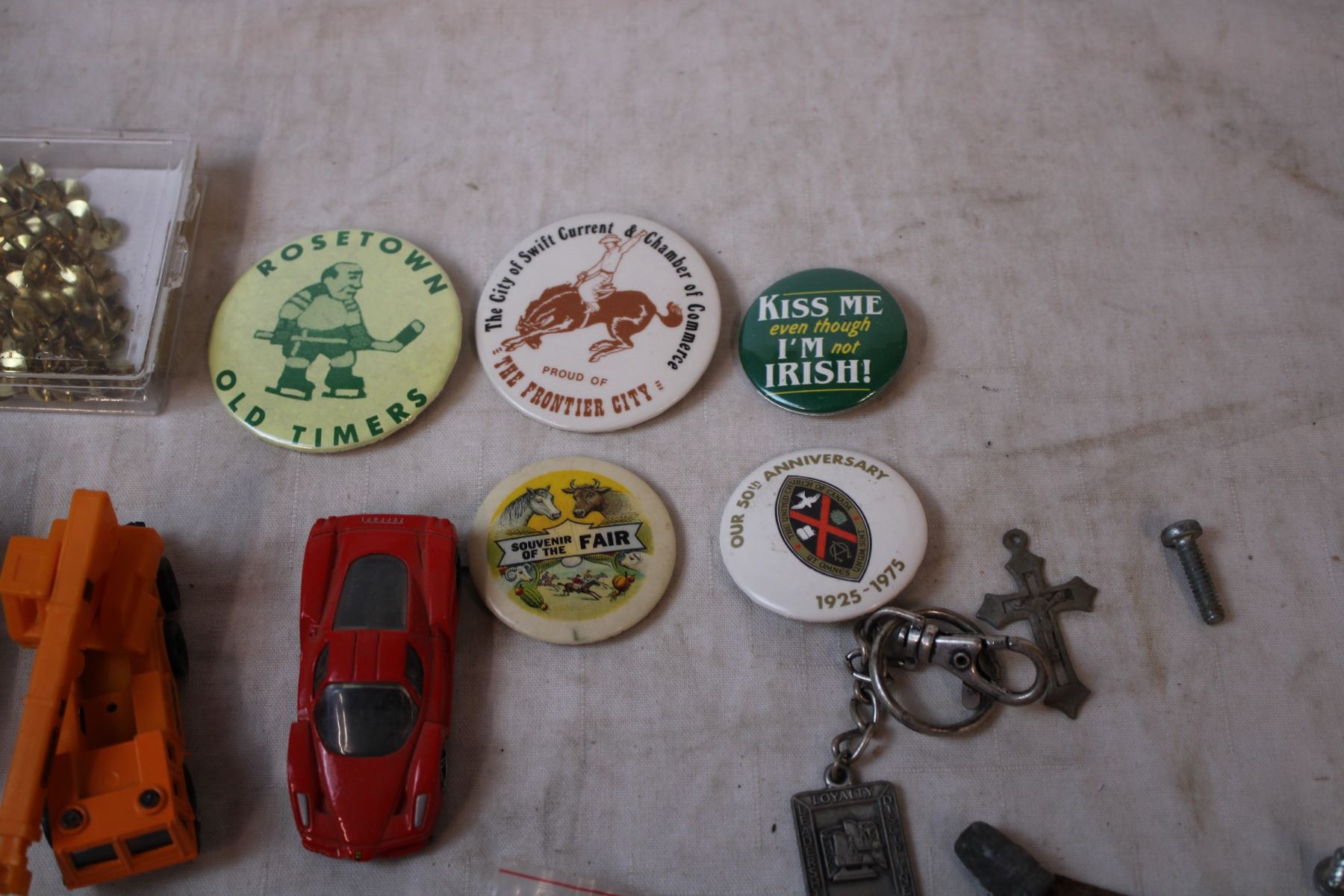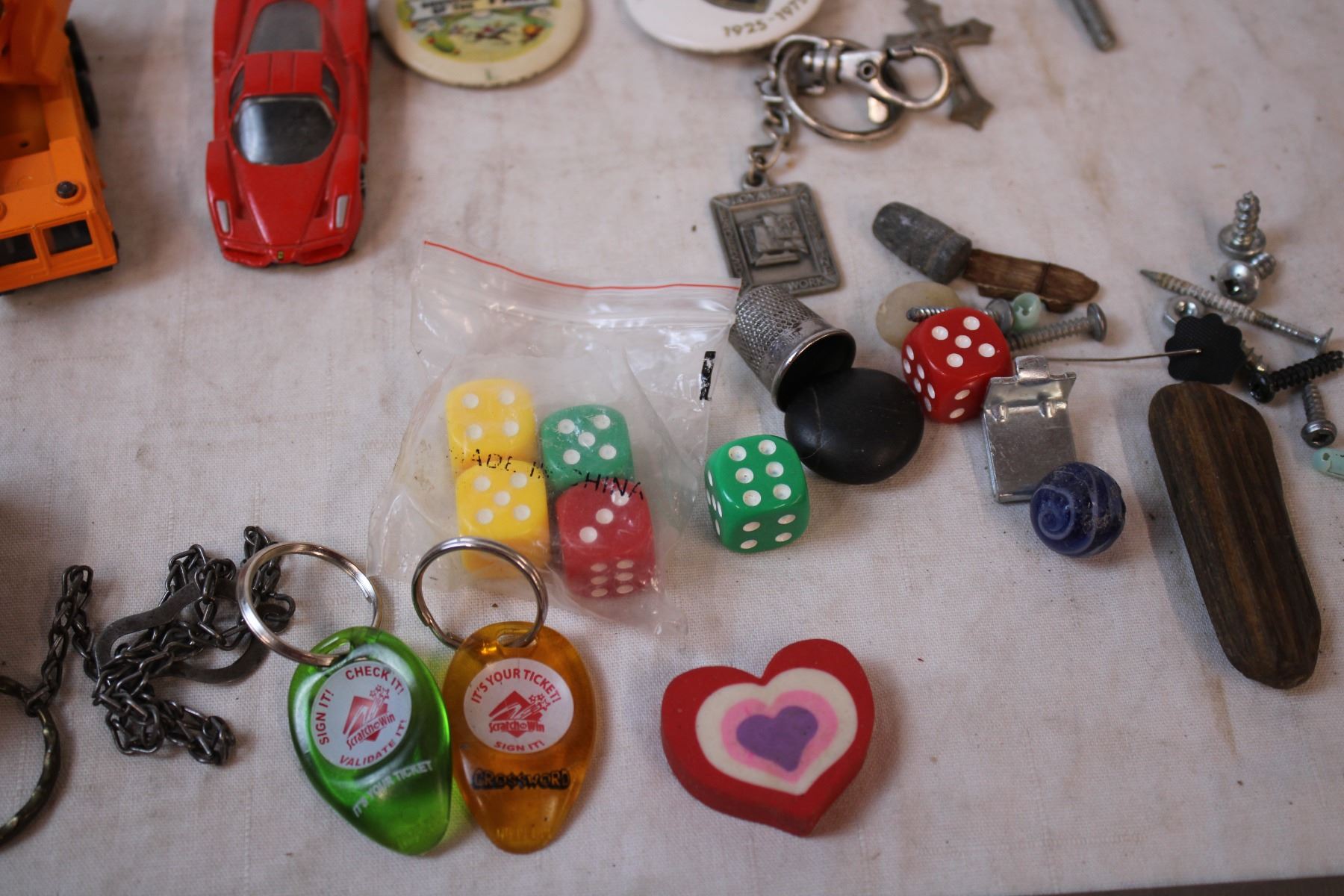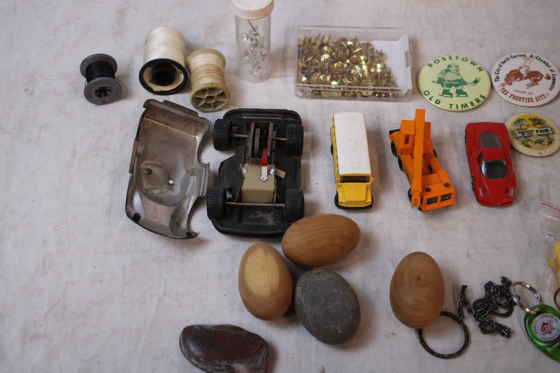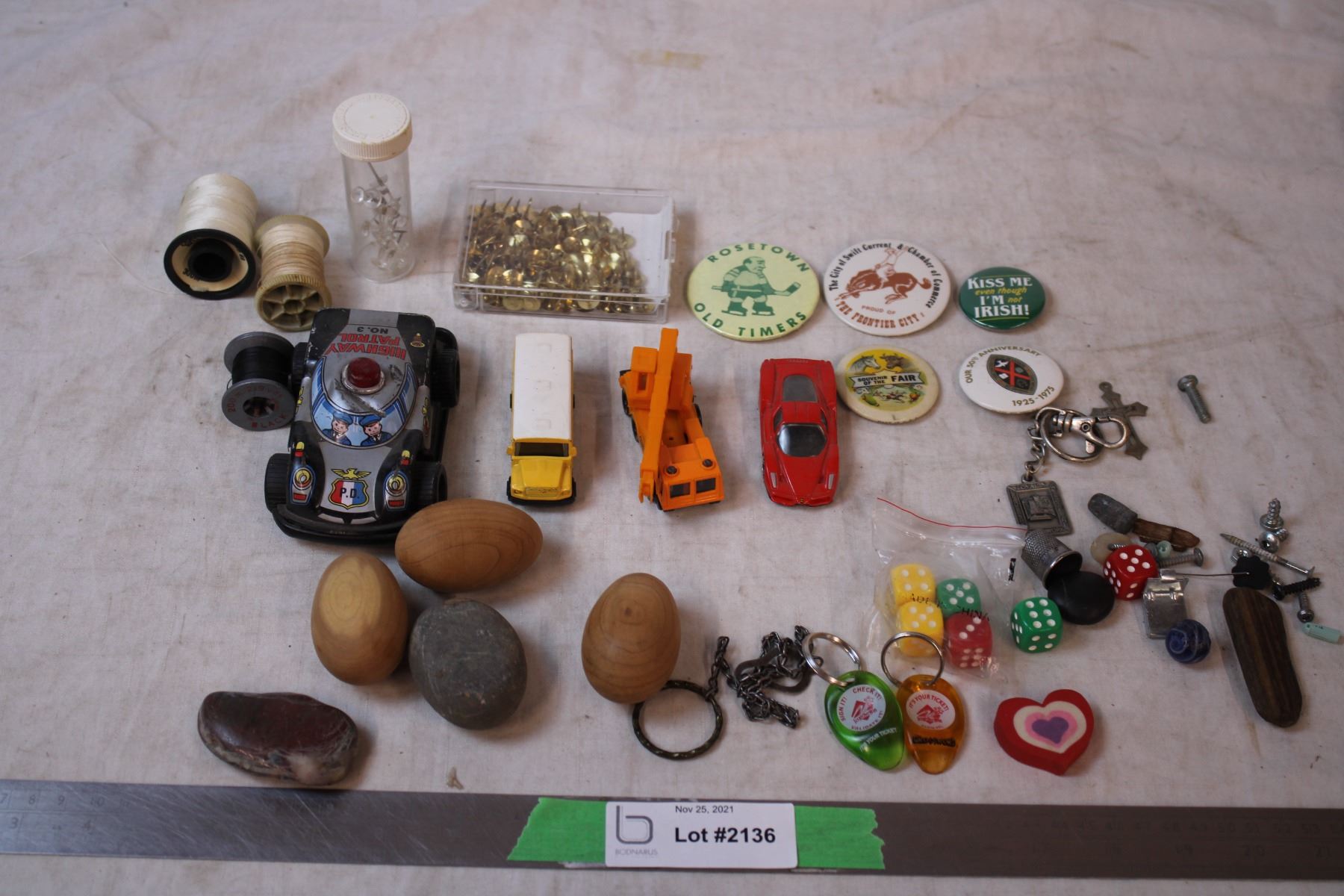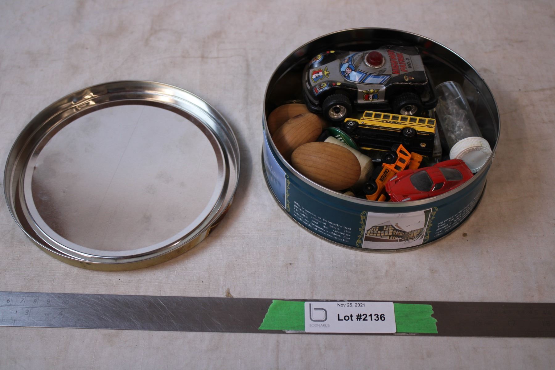Tin with toy cars, pins, dice, Keychains, wooden eggs