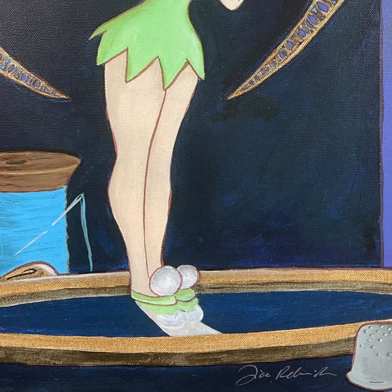 "Tink's Reflection" is a limited edition proof giclee on canvas by Tricia Buchanan-Benson, numbered and hand signed by the artist. This piece is licensed by Disney Fine Art. This piece come gallery wrapped. Includes Letter of Authenticity. Measures approx. 22" x 28" (image). There is very minor wear around the corners and edges.