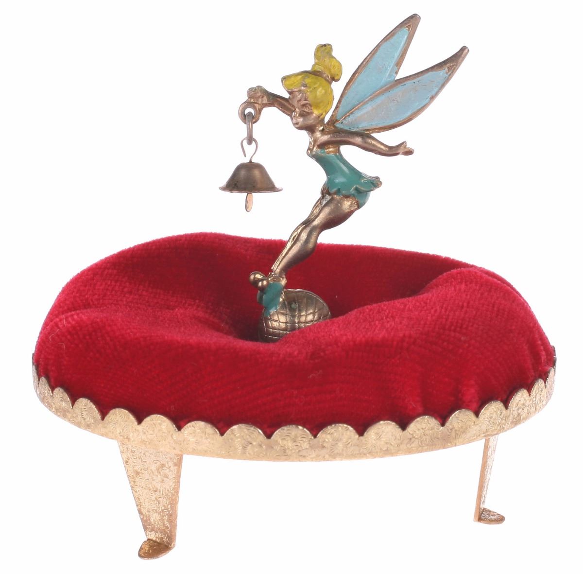 (Disneyland, 1950s) Colorful painted Tinker Bell figural pin cushion with red fabric base. Set measures 3.25" in diameter and 3.5" tall in its original packaging. In good condition with some wear.