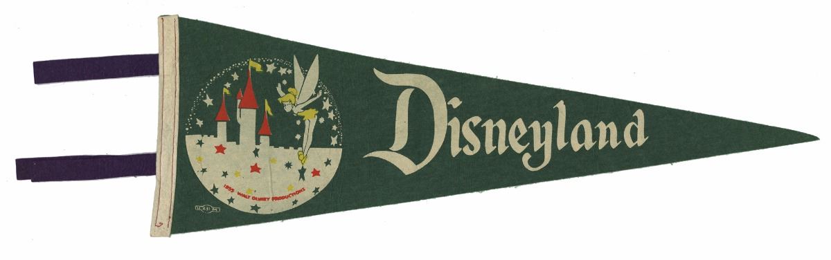 (Disneyland, 1950s) A very early green and white Disneyland pennant with Tinker Bell and Castle imagery. Measures 8"x26.5". In good condition.