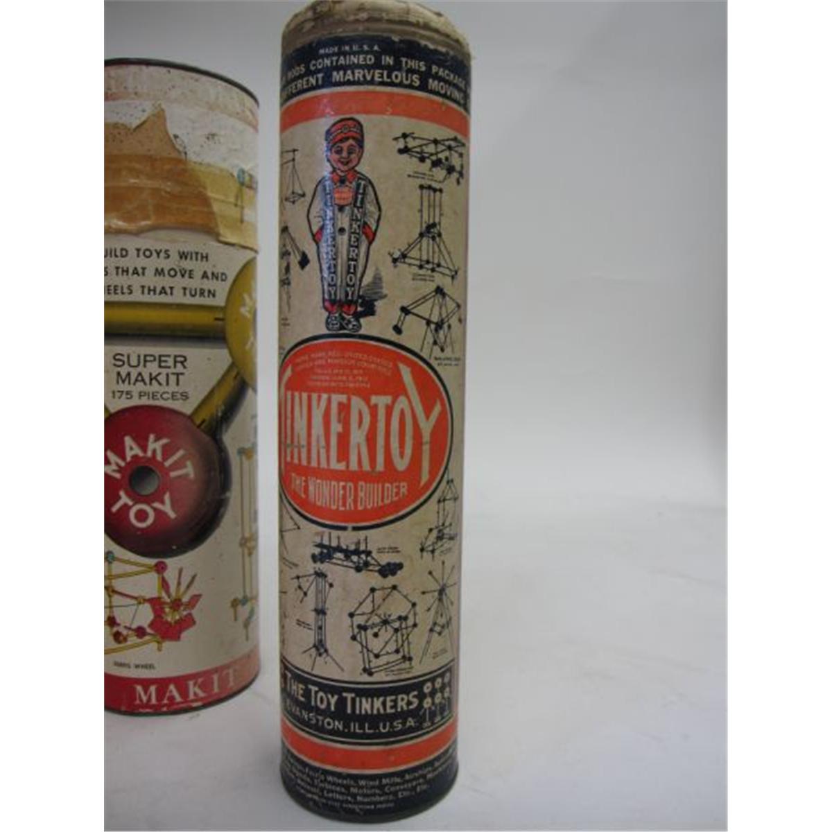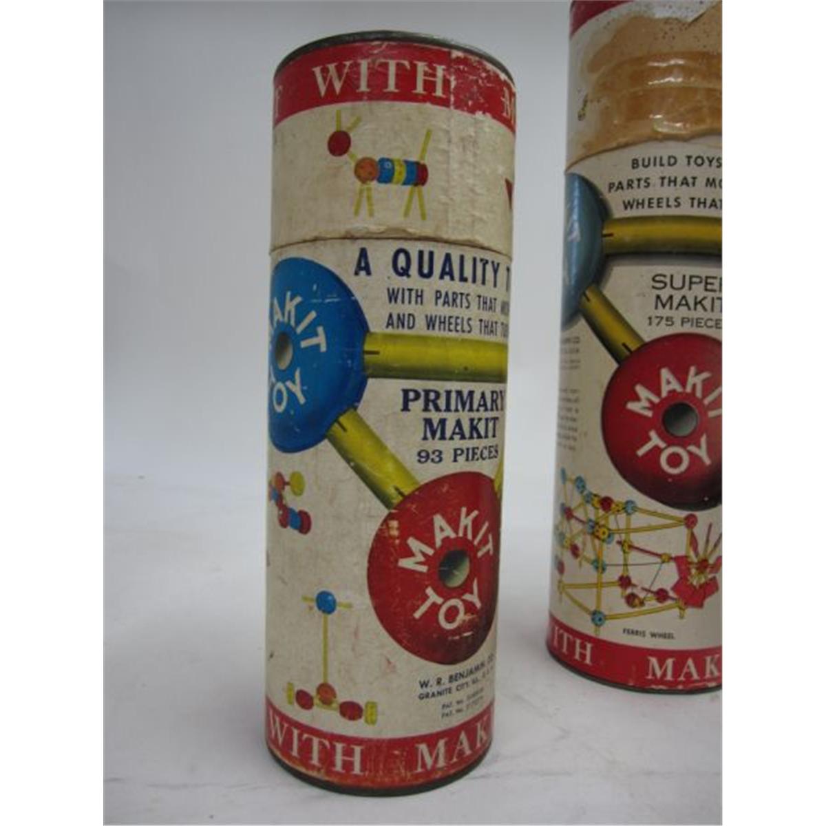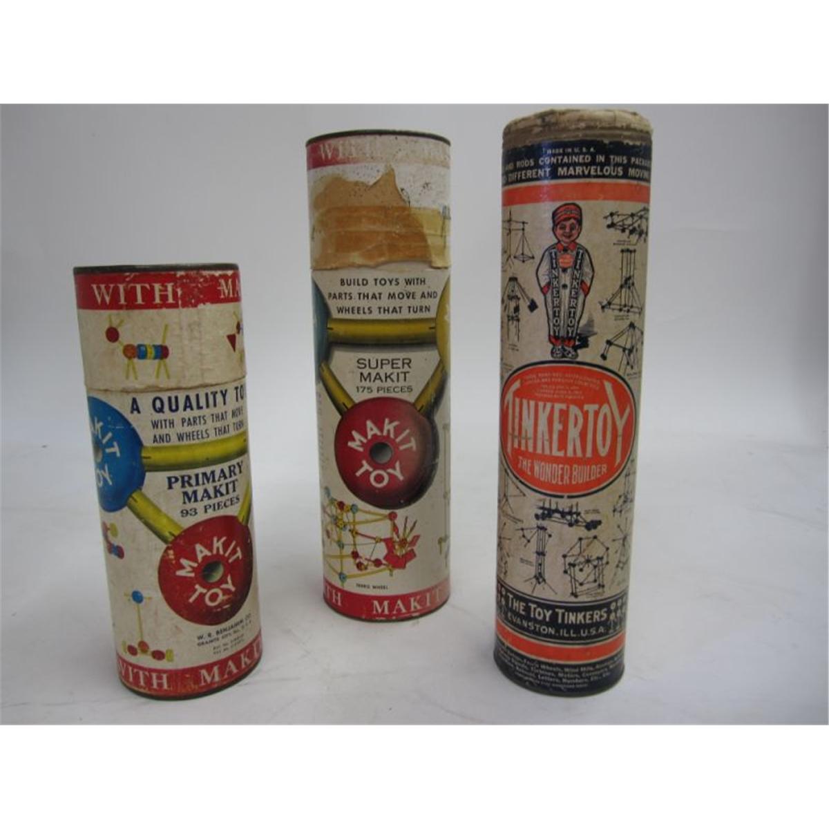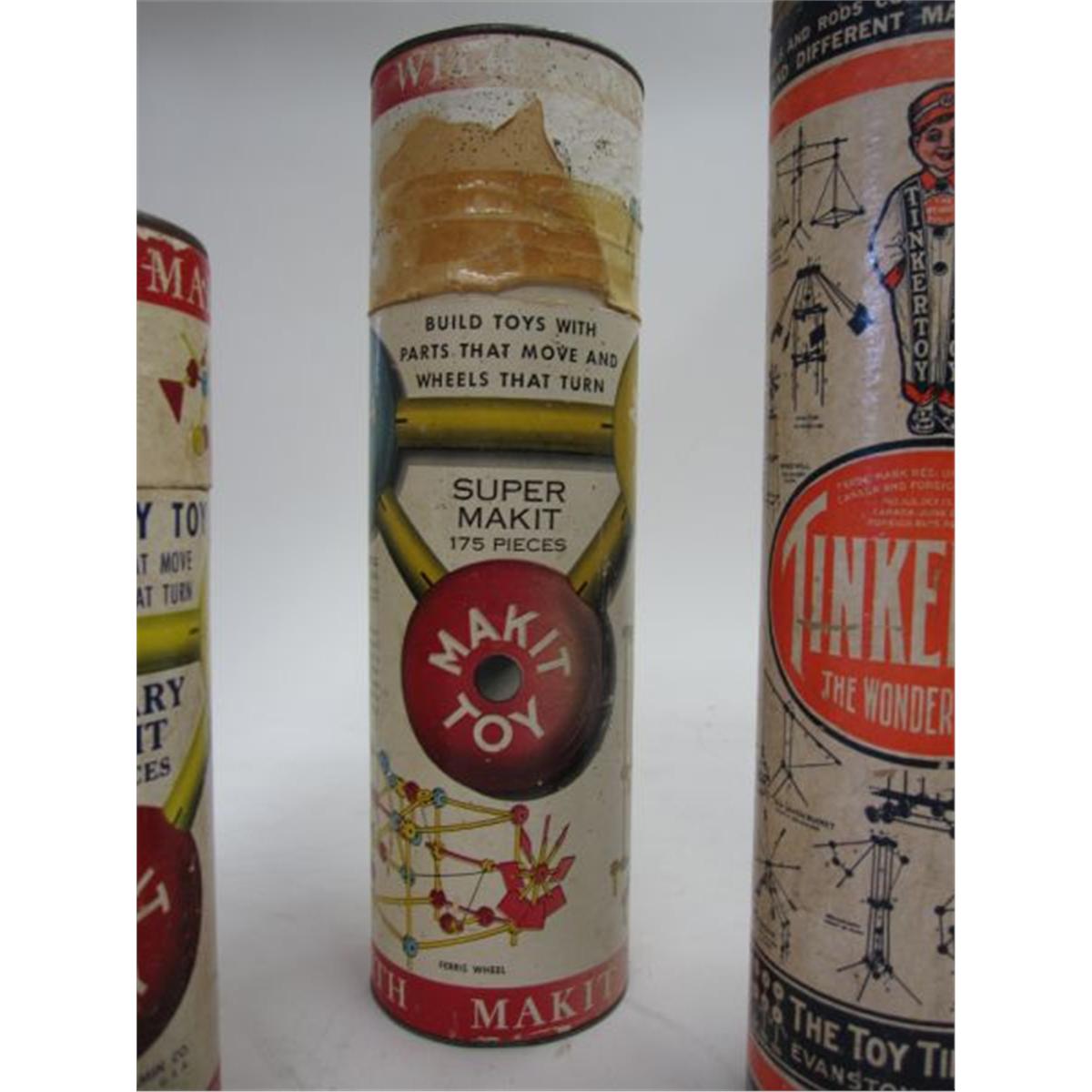 Three Tinkertoy and Makit sets. Both of the Makit sets have the original packaging intact, and the Tinkertoy set has the original tube but no lid. Items themselves are in good condition. Vintage items, from the early 1900's.