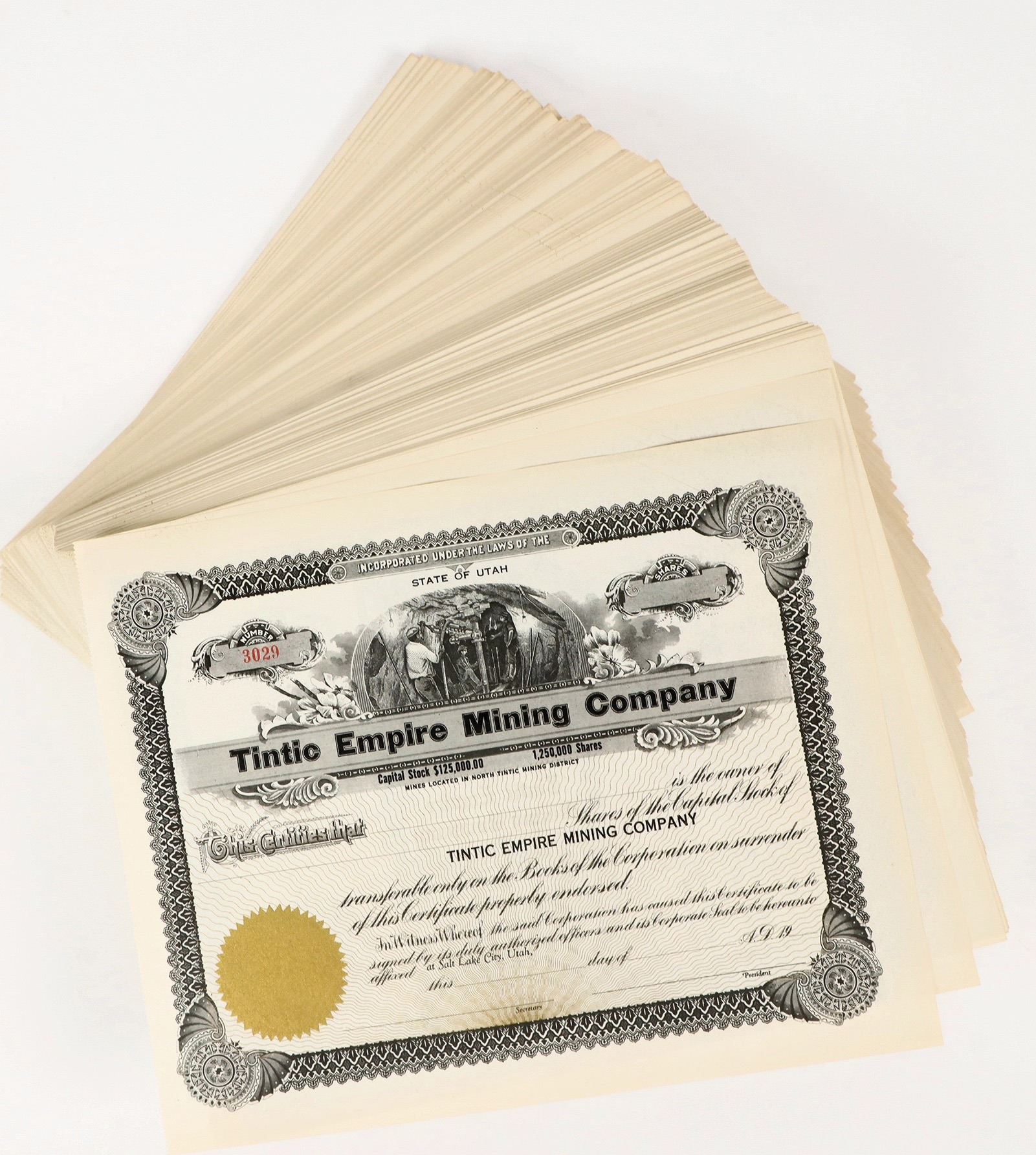 Tintic Empire Mining Co. Unissued Stock group, about 300 pcs or more. 19xx. Datelined Salt Lake City.