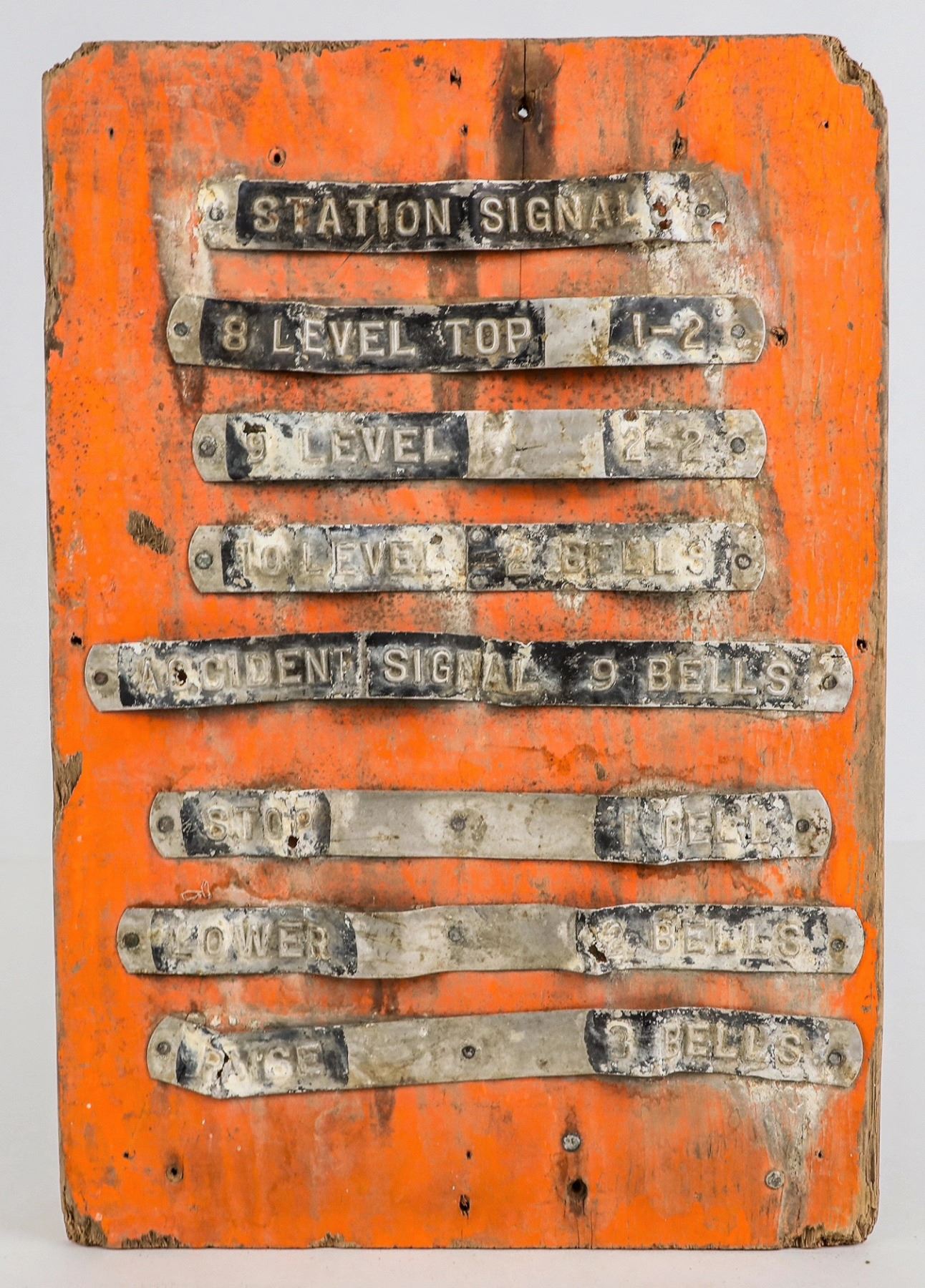 Classic mine-made mine bell signal sign from the Goeff Pollock Collection. Goeff collected heavily at Tintic, and this bell signal sign is a classic one of one., The bell signal directions are stamped out on tin strips, going down to the tenth level (usually one hundred feet pre level). Mounted on board, and painted orange for importance. 11 x 16"