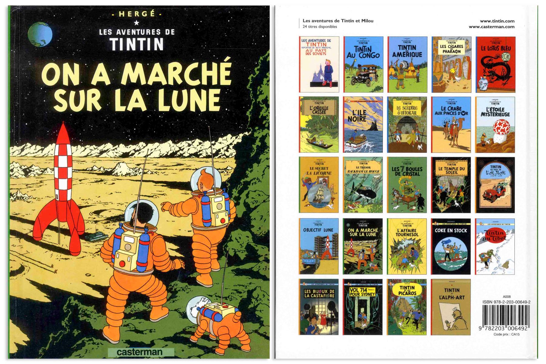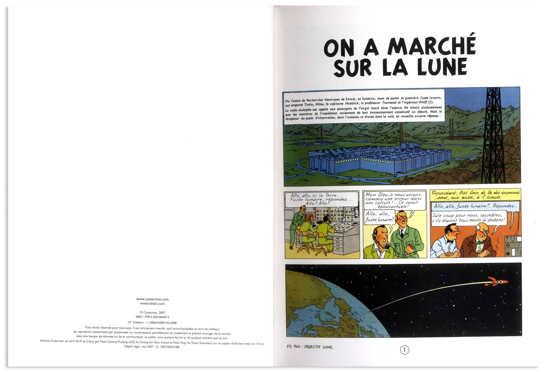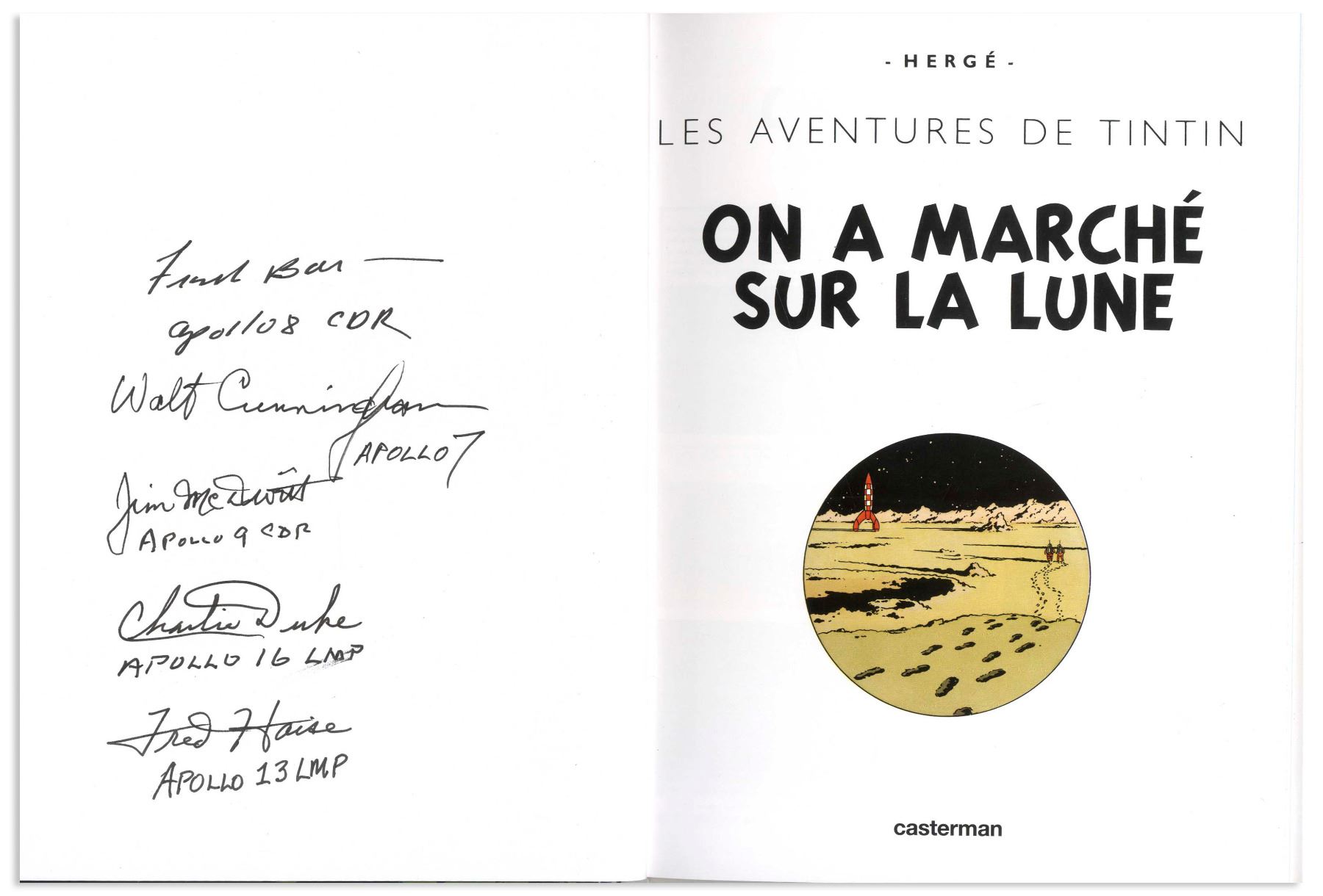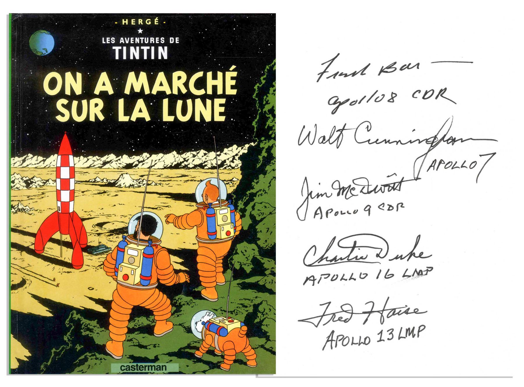 Tintin book about the moon landing signed by five Apollo astronauts: Frank Borman of Apollo 8, Walt Cunningham of Apollo 7, James McDivitt of Apollo 9, Charlie Duke of Apollo 16, and Fred Haise of Apollo 13. French edition book of ''The Adventures of Tintin'' is about Tintin, Snowy, Captain Haddock and Professor Calculus exploring the moon. Signed on the front free endpaper by all five astronauts, who also add their Apollo mission. Book measures 6.625'' x 8.75''. Near fine condition.