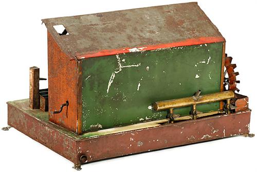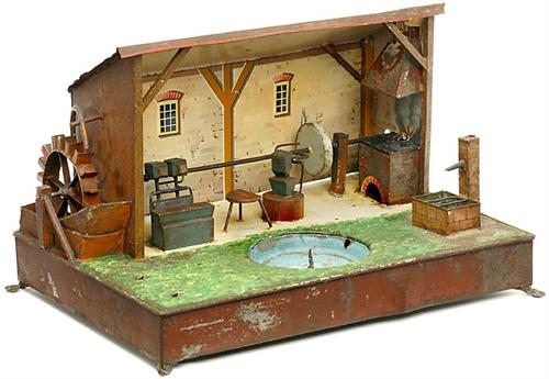 Tintoy: Hammer Mill "Rock & Graner", c. 1880 Water driven hand japanned tin toy, original condition without any restoration or new paint, dimensions: 14 1/2 x 10 1/5 x 9 1/2 in., with mains water supply on the back, 3 different valves for water wheel, basin and fountain, 3 working hammers, additional handcrank for manual operation. - Authenticity prooved by famous tin toy expert! - One of the rarest tin toys ever made by famous German manufacturer "Rock & Graner" in Biberach! - Not mentioned in any literature!<Br>