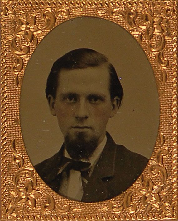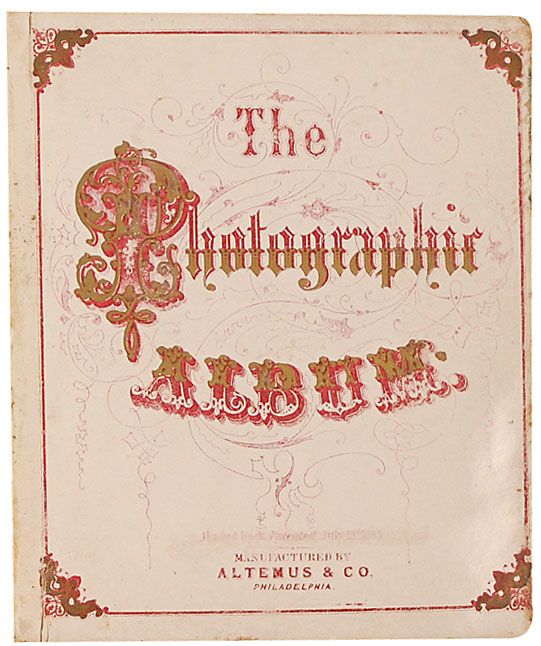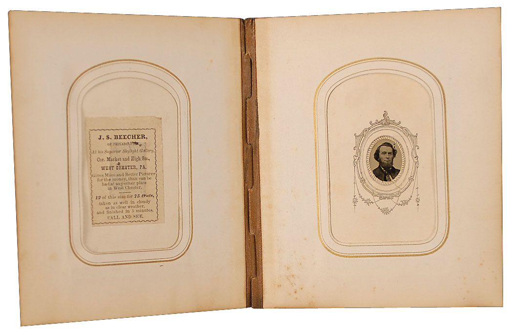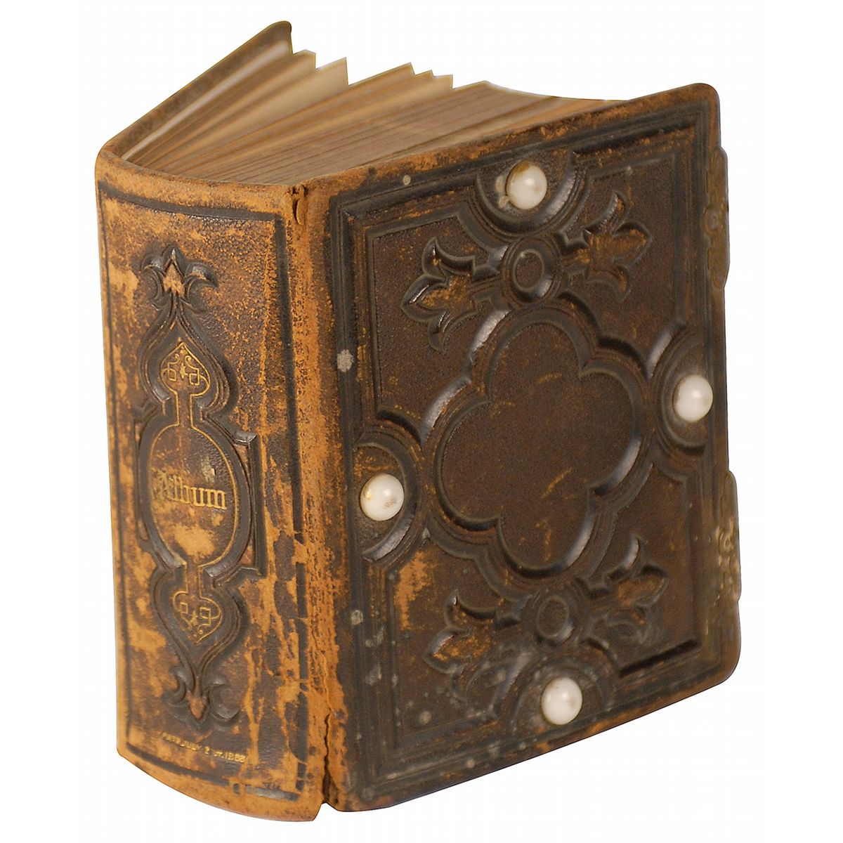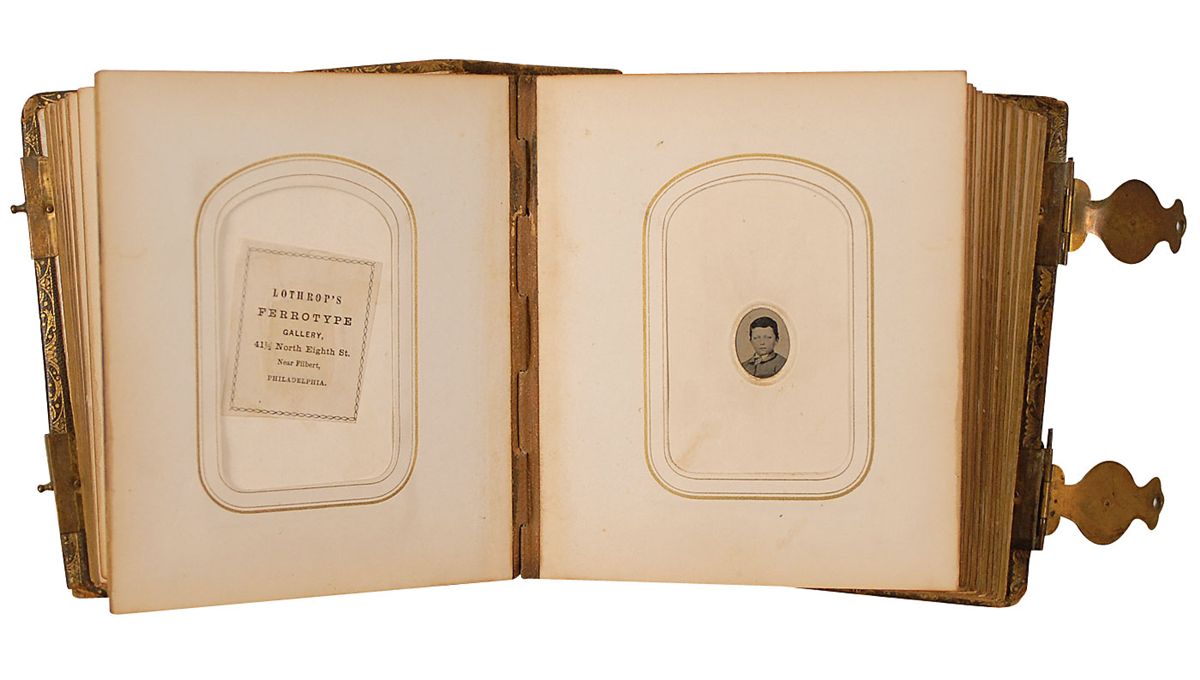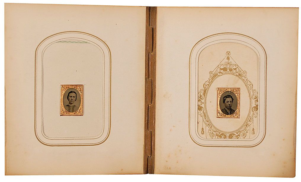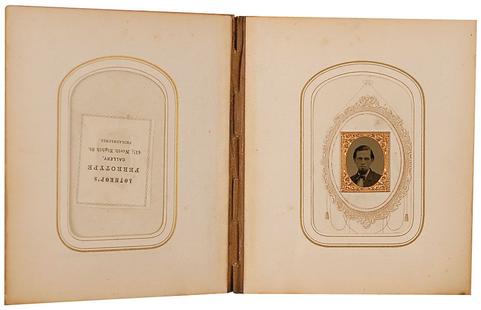 Quality original 1860s thick leather-bound photo album, 6 x 6 x 2.5, containing approximately 26 original 1860s gem tintype cartes-de-visite, most with original photographers’ paper tags affixed to reverse. The cards are attractively stylized, with printed and embossed designs bearing head shot portraits, presumably of family and friends of the album owner. They resemble regular carte-de-visite photographs, except they have genuine tiny tintypes for the images, each approximately the size of a nickel. The embossed and ornate dark leather album bears its original and intact metal latches. Album shows heavy wear, including split leather in parts and general wear and surface damage. Front manufacturer’s page indicates the album was patented in 1863. Photos show light wear with sharp, clear images.