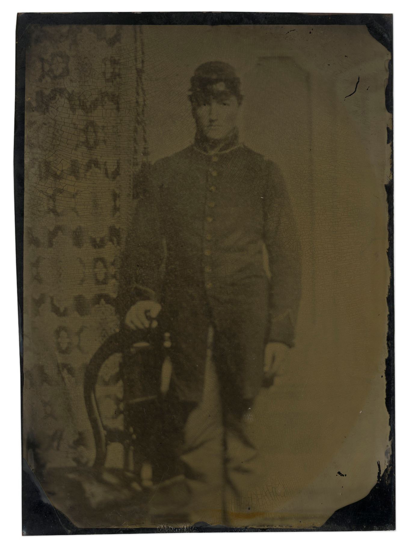Tintype civil war photo of Union soldier standing in full view. He wears a nine-button frock coat with stand-up collar and chevron sewn on both sleeves. In addition the soldier wears his regulation kepi and trousers. The tintype measures 5'' x 7''. The image has a soft focus and displays a yellow-brown patina. Photo is missing the original oval matte frame, otherwise very good condition.