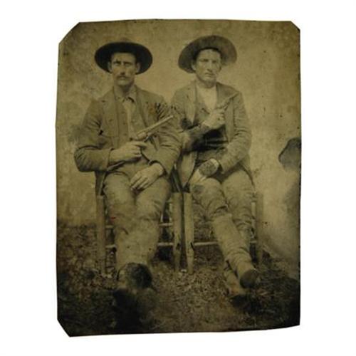 <B>Tintype - Two Cowboys With Drawn Weapons</B></I> A sixth plate tintype of two cowboys seated, and posed identically with right arms across their chests holding their revolvers, and left hands resting in their laps. A very light red tint has been applied to their cheeks. A few photographic stains and surface scratches; however the image has retained great detail and contrast. Trimmed at corners.<BR><BR><b>Shipping:</b> Flat Material, Small (<a target="_blank" href="http://www.heritageauctions.com/common/shipping.php">view shipping information</a>)