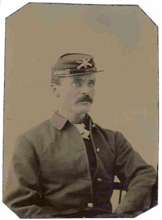 Tintype of late 19th century Infantry soldier in full uniform with clipped corners. Mustached soldier, with tinted cheeks, wears his M-1873 kepi and sits on a wooden chair. Photograph, which measures 2.75'' x 3.75'', shows soldier from the waist up. Very good contrast. Excellent.