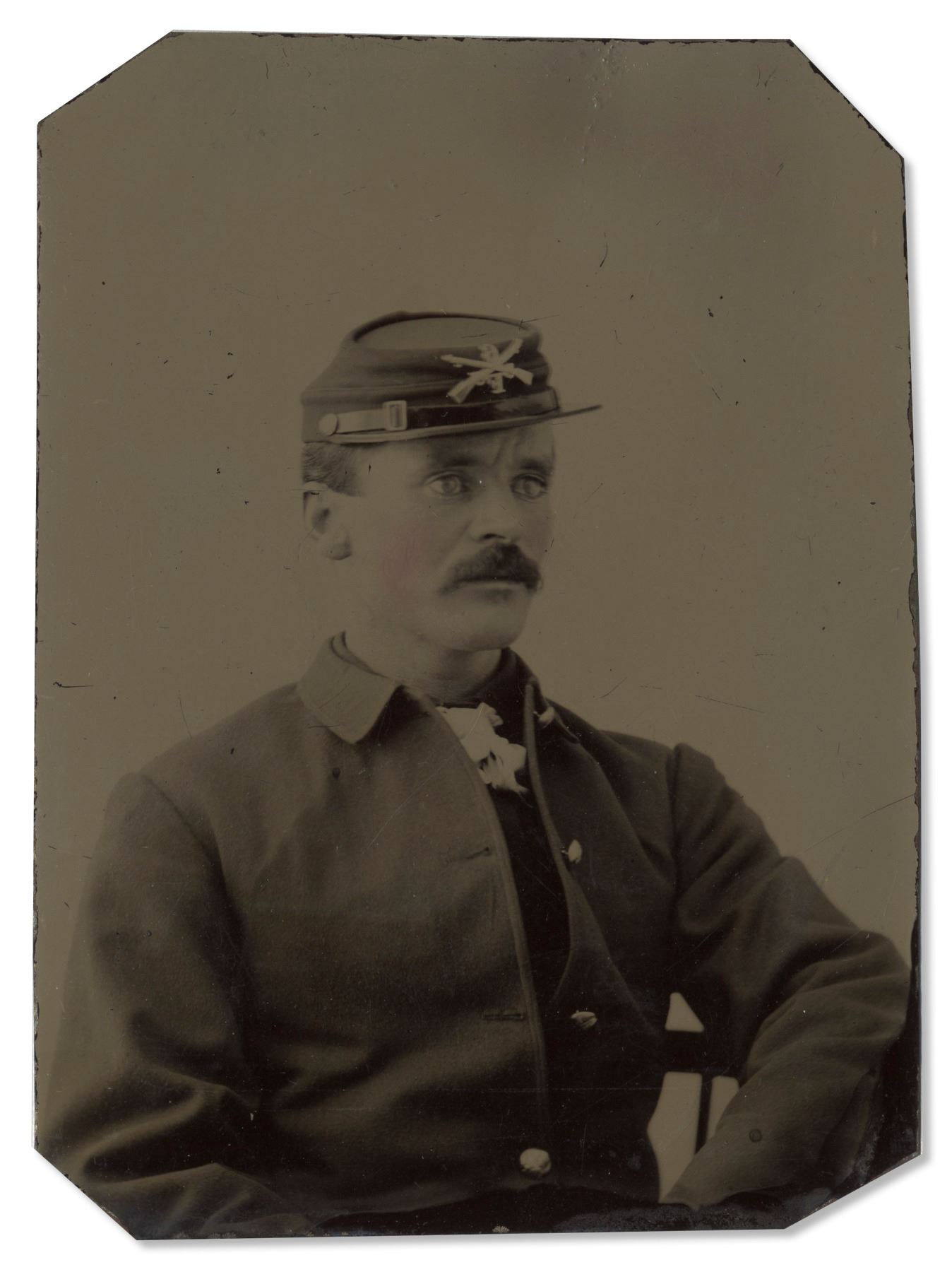 Tintype of late 19th century Infantry soldier in full uniform with clipped corners. Mustached soldier, with tinted cheeks, wears his M-1873 kepi and sits on a wooden chair. Photograph, which measures 2.75'' x 3.75'', shows soldier from the waist up. Very good contrast. Excellent.