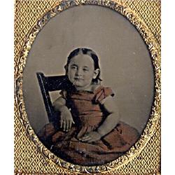 This is the same charming girl as in the daguerreotype, Lot 21. This is a pair of 1/6 plate melainotypes (early tintypes) in full cases. In one she is with her large dog. That one is covered by a convex glass. In the other she poses on a chair.