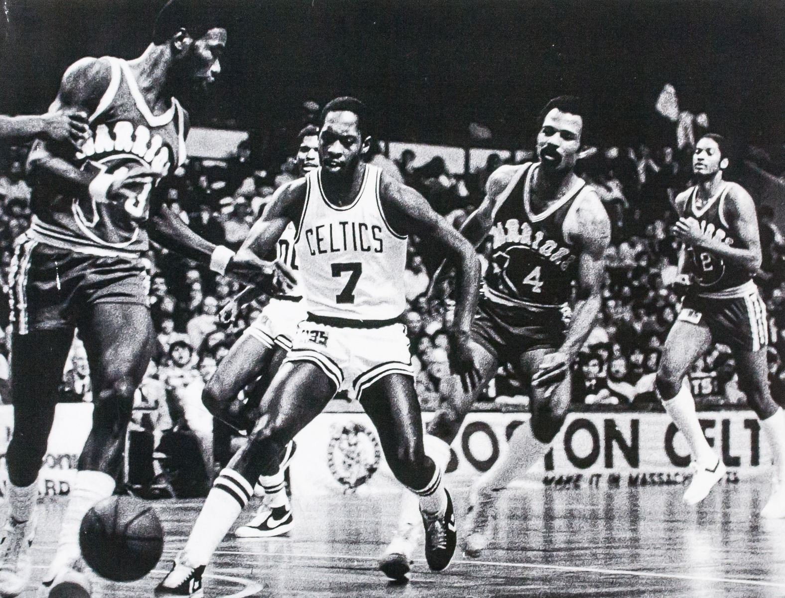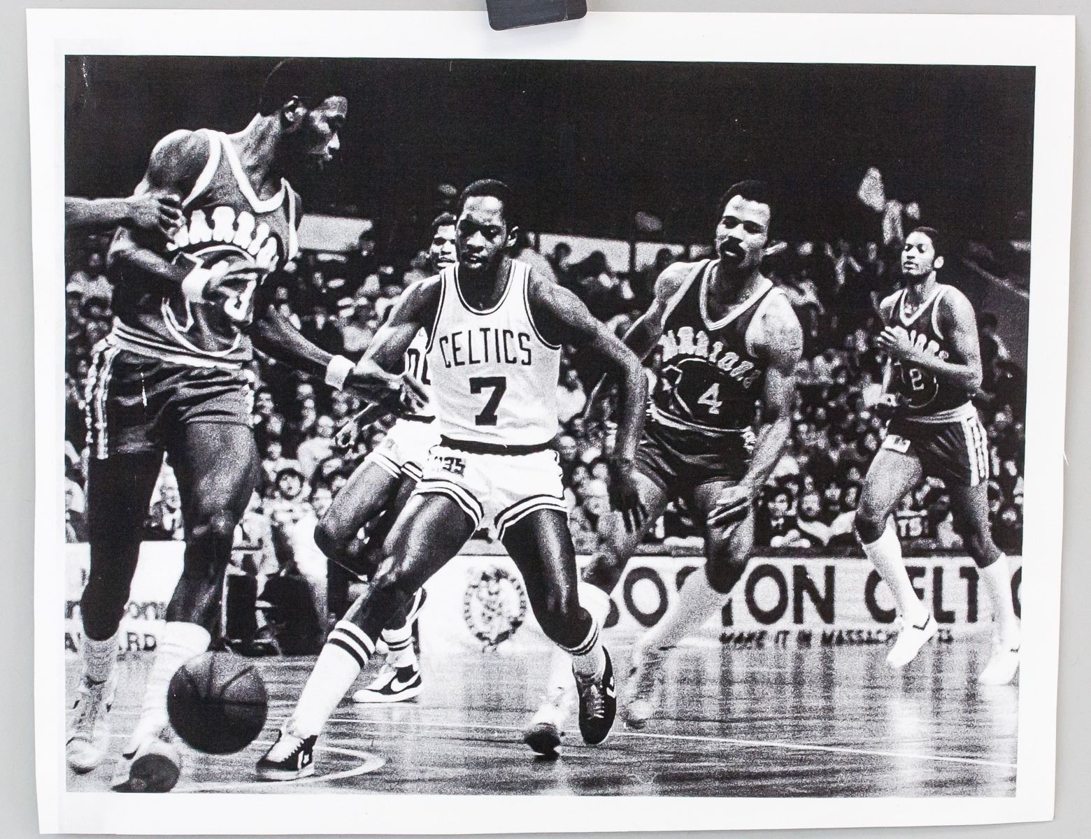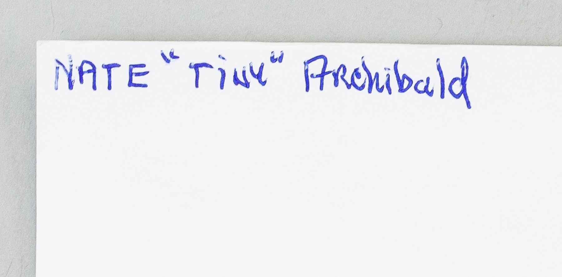 Black and white photograph. Featuring Tiny Archibald (1948- , American). Nathaniel "Tiny" Archibald is an American retired professional basketball player. He spent 14 years playing in the National Basketball Association, most notably with the Cincinnati Royals, Kansas City–Omaha Kings and Boston Celtics. In 1991, he was enshrined in the Naismith Memorial Basketball Hall of Fame. 8 x 10 inches