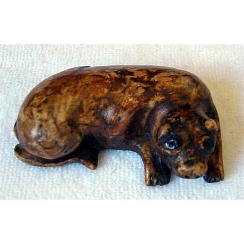 This tiny burl snuff box (to find the hidden opening door, turn the dog over and, voila, there it is!)measures only 2 1/4" x 1 1/4" and is a tiny bit over 1/2" high. He has plaintive, hound-dog eyes, and a nice long tail, but the breed identification will have to be left up to your imagination. The lid opens--hinge is sound--and all is in good shape. A charming find!
