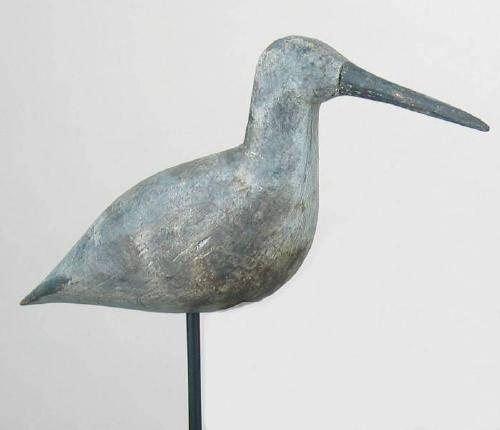 Tiny Peep decoy from the Mackey collection with Lou Barkelow written in pencil, "LB" branded and 1184 written in ink near the stick hole on the bottom. Appears to be OP with wear to the edges of the tail. Stain on the breast . (decoy)