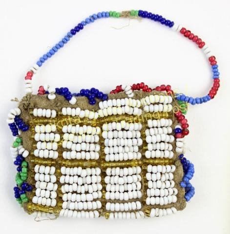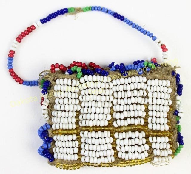 1 3/8"X 1 7/8" sinew sewn lazy stitched on native tanned leather, reds, greasy yellow, blues, green, white, c. 1890's. Est. 200-400