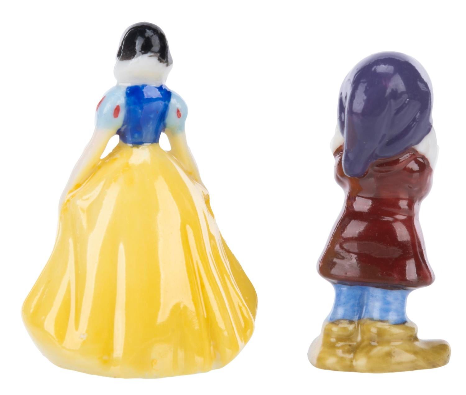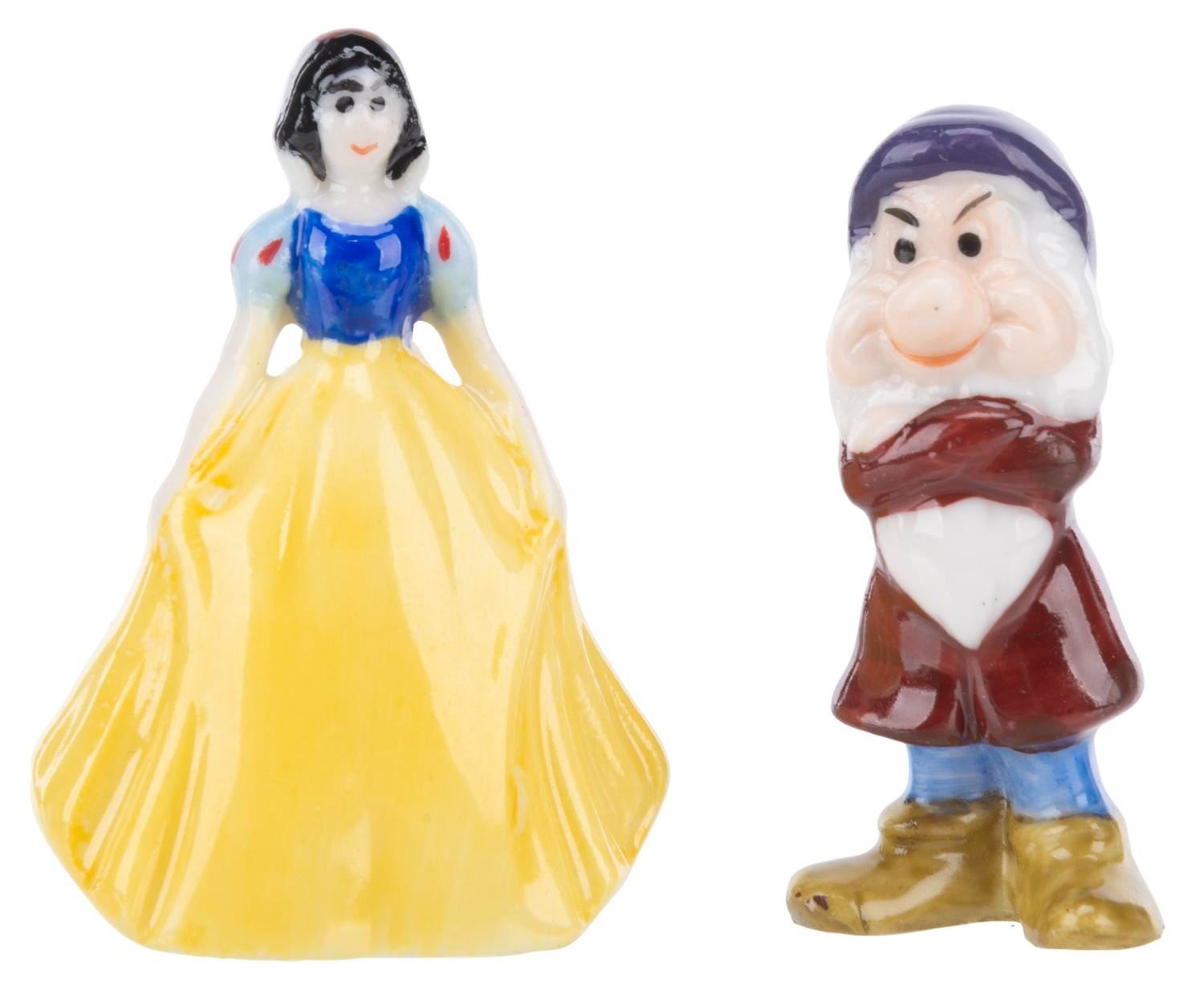 (Disney, 1970s-90s) A pair of tiny ceramic figurines of Snow White and Grumpy. Standing 1.5" and 1.75" tall, the figurines are in fine condition.