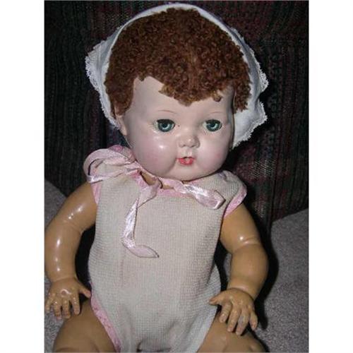Tiny Tears 1950's American Character Doll . Hard plastic head with tear ducts and open and close eyes. Doll has all eyelashes, there is a little rub to the back of wig. Marked on back of head with patent number etc. Rubber body is very good with one crack on one finger. Comes from a smoke free environment. Buyer to pay $20 shipping, handling, and insurance. Thanks for viewing.
