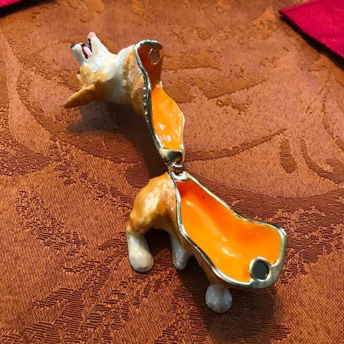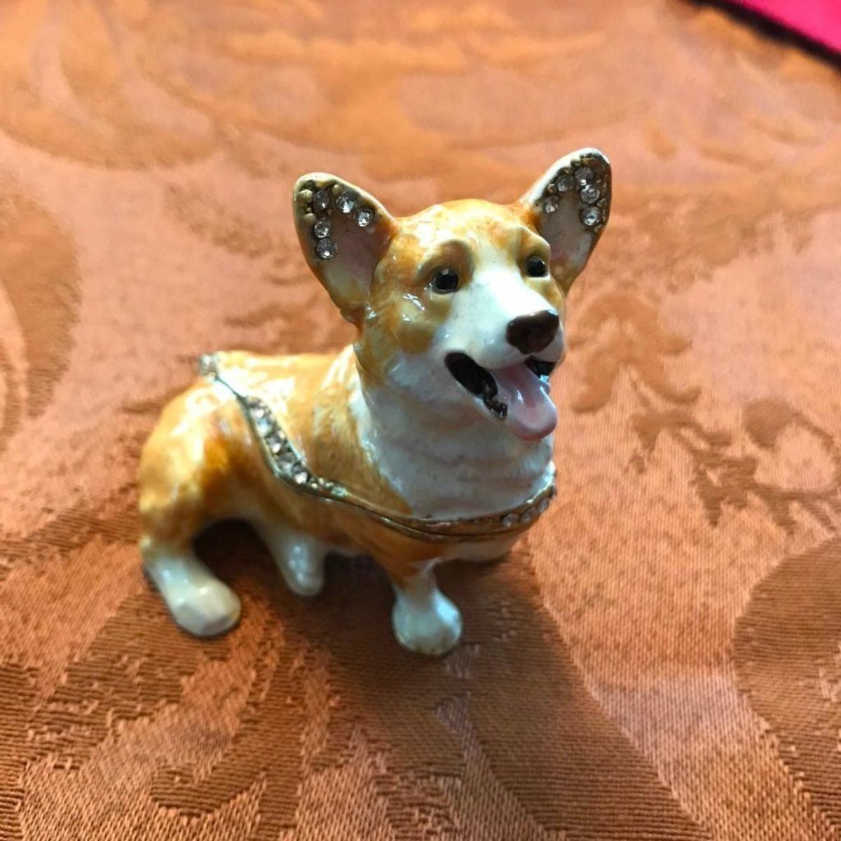 Precious little Welsh Corgi dog, pet theme jewel or trinket box. Opens at center on a hinge, with magnetic closure to reveal an enameled hiding place for jewels or trinkets. Hand-painted enamel & gilt over pewter with embedded Austrian crystals. 2 1/2" H X 2 1/2" L. Comes with gift box.