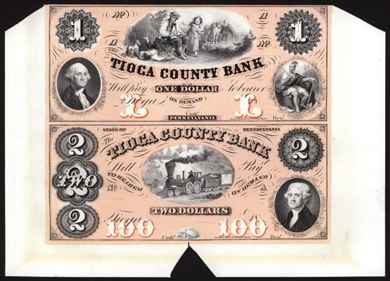 Tioga, Pennsylvania, 18xx, (originally printed in 1857, these are ca.1960-70's), $1-$2, Plate A-A, (PA-640-G2a; G4a), Unlisted in orange, listed with red underprint, Modern ÒProprietary ProofÓ, The $1 note has man with children, horses and dog in top middle, George Washington on LL and Native American with hatchet on LR; The $2 note has Locomotive in middle with Thomas Jefferson on lower right, Black printing with orange underprint printed on thin white card, CU to Gem Uncirculated condition. ABNC. Rare as uncut sheets. (ABN Commemoratives, AIA XI, May 15, 2012)