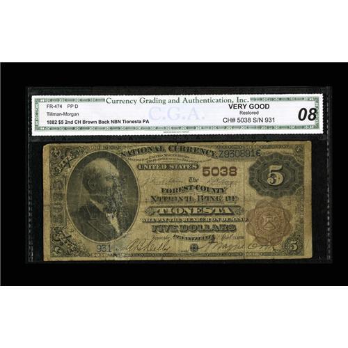<B>Tionesta, PA</B></I> - $5 1882 Brown Back Fr. 474 <B>The Forest County NB</B></I> Ch. # 5038<BR>This <B>CGA Very Good 08, Restored</B></I> is one of only four large size notes reported from this institution. The purpose of the restoration is unclear.