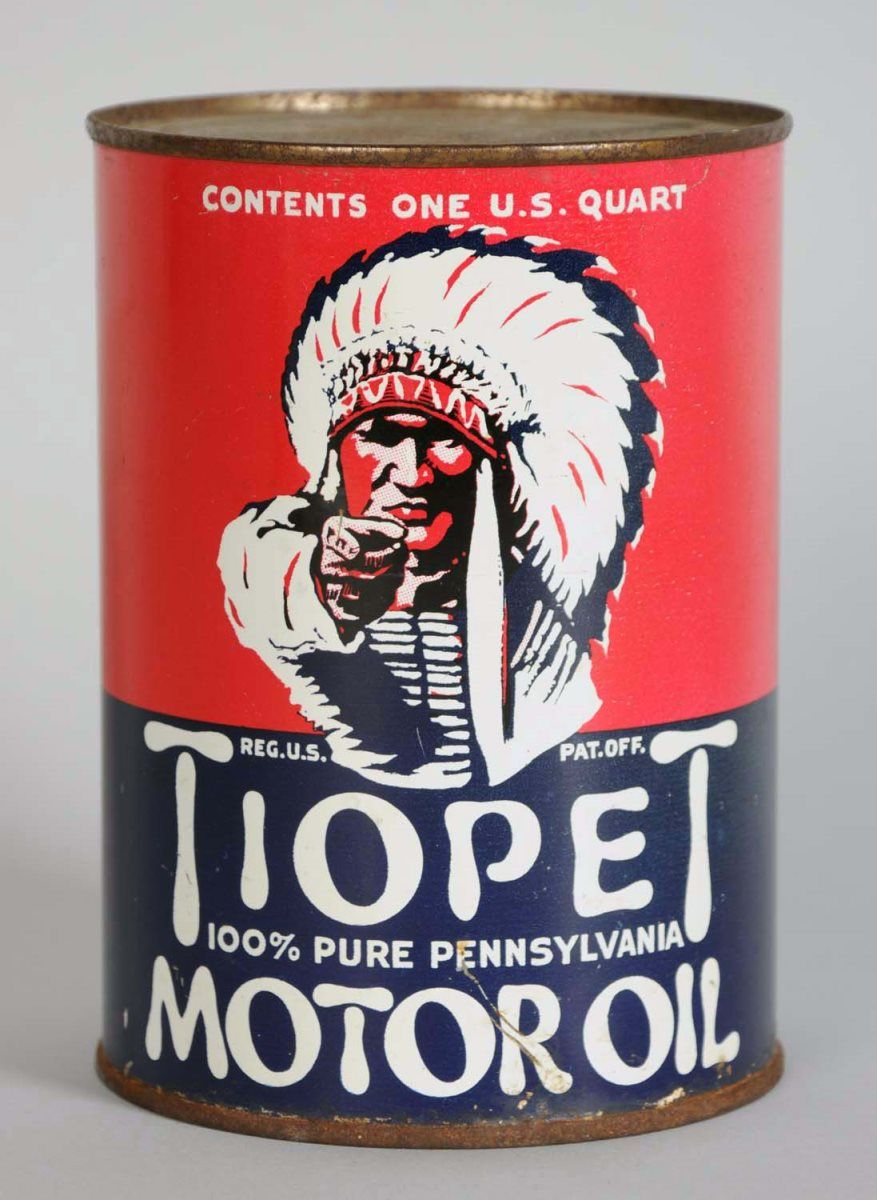 Full 1 quart size can with soldered seam featuring Indian with full headdress graphics, top is labelled Premium 20, "100% Pure Pennsylvania". Can has great color and shine with some light wear and small scratches at the bottom. Condition (Very good). Size