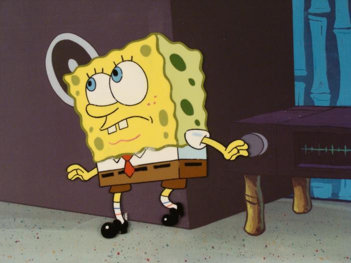 This animation cel, reproduction background, and drawing are from the Nickelodeon TV show SpongeBob Squarepants. The story takes place under the deep blue sea in Bikini Bottom, where SpongeBob resides. SpongeBob, who is a yellow, porous sponge, is your typical happy-go-lucky character, as he is always cheerful and enjoys making people laugh. Patrick Star, SpongeBob's neighbor who is a starfish, is your average children's show idiot, as he boasts knowing nothing and is often getting himself into ridiculous situations. Between the homes of these two lies the home of the miserable Squidward, a squid, who is known for being grouchy and playing tricks on SpongeBob and Patrick. Both SpongeBob and Squidward work at the Krusty Krab, a fast food business run by the greedy money-loving Mr. Krabs, a crab, the arch rival of the evil, possibly misunderstood, Plankton. Another neighbor, Sandy Cheeks, an athletic squirrel who normally wears an astronaut's space suit, was introduced in "Tea at the Treedome." She spends most of her time inventing and experimenting. SpongeBob looks like he is tiptoeing.Original Printed Background and Animated Cel Overall Size of Background: 11" x 17" Overall Size of the Cel: 10 1/2" x 12 1/2" Overall Size of the Drawing: 10 1/2" x 12 1/2"Very good condition This is an original hand-painted cel set-up used in the production of an episode of "SpongeBob SquarePants." Each one-of-a-kind set-up represents a slight change in position of the characters. When individually photographed and projected in rapid succession, the images appear to move.