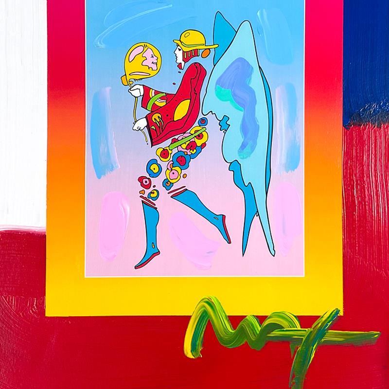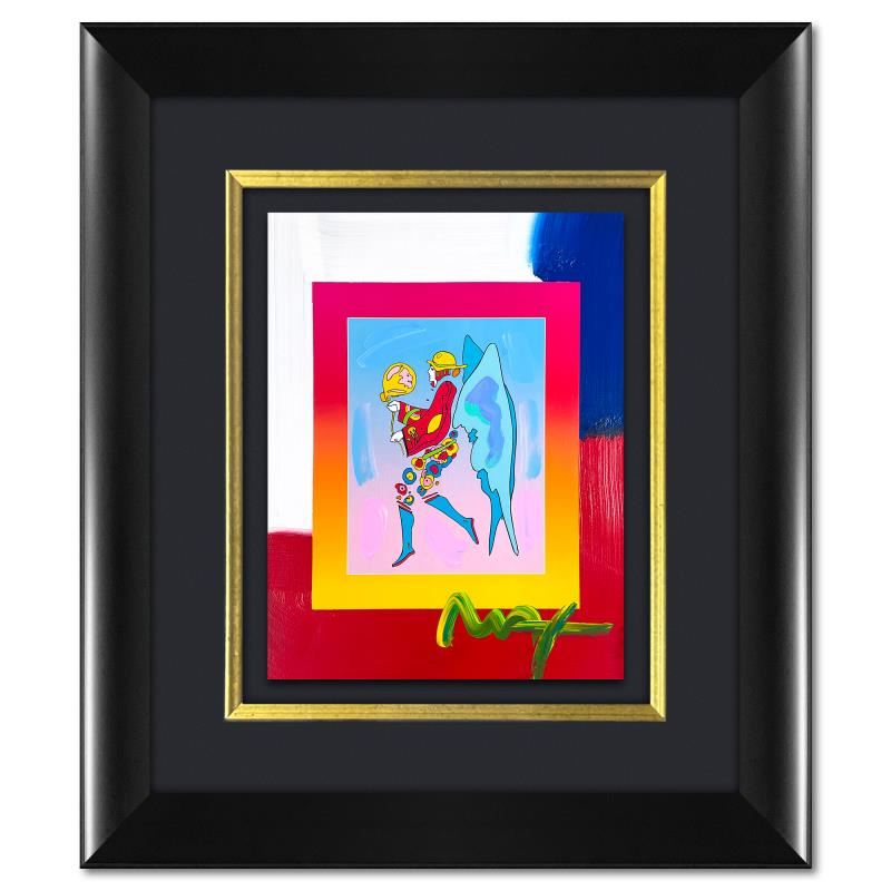 "Tip Toe Floating" is a one-of-a-kind acrylic mixed media on paper, hand signed by Peter Max. The piece comes custom framed with a backside cutout to display Peter Max Studio registration number 268904 certifying authenticity. Measures approx. 30" x 26" (frame), 17" x 13" (image).