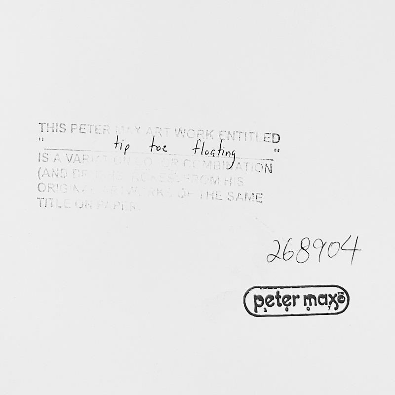 "Tip Toe Floating" is a one-of-a-kind acrylic mixed media on paper, hand signed by Peter Max. The piece comes custom framed with a backside cutout to display Peter Max Studio registration number 268904 certifying authenticity. Measures approx. 30" x 26" (frame), 17" x 13" (image).