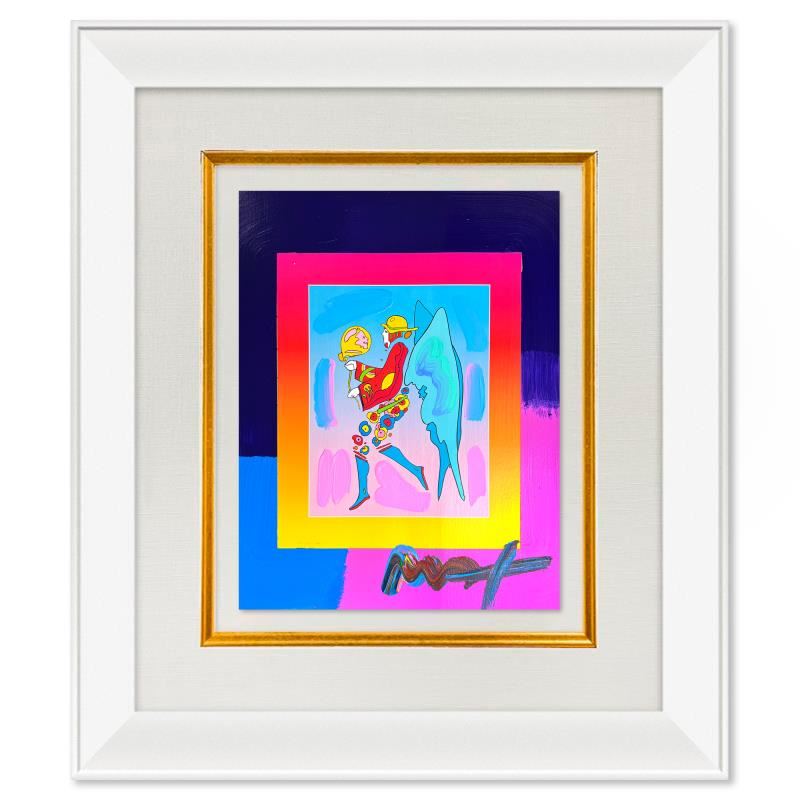 "Tip Toe Floating" is a hand signed one-of-a-kind acrylic mixed media on paper by Peter Max. The piece comes custom framed with a backside cutout to display Peter Max Studio registration number 270400 certifying authenticity. Measures approximately 30" x 26" (frame), 17" x 13" (image).