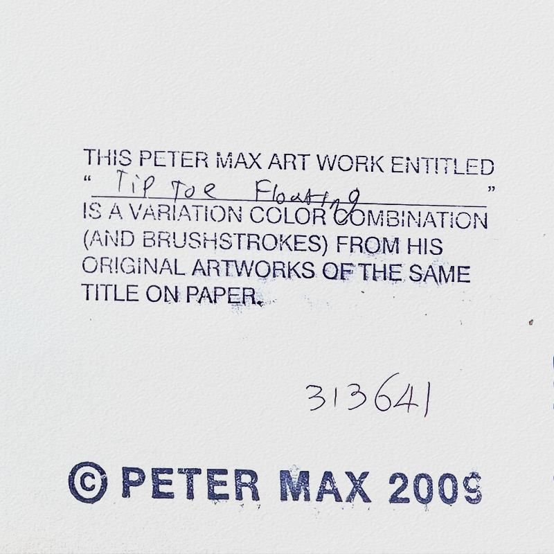 "Tip Toe Floating" is a hand signed one-of-a-kind acrylic mixed media on paper by Peter Max. The piece comes custom framed with a backside cutout to display Peter Max Studio registration number 313641 certifying authenticity. Measures approximately 26" x 23" (frame), 13" x 10" (image). This item requires special handling and may have a longer than usual turnaround.