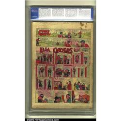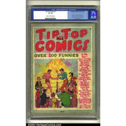 Tip Top Comics #1 (United Features Syndicate, 1936) CGC GD+ Cream to off-white pages. Tarzan squares off against L'il Abner in a boxing ring on this historic comic cover which features the first comic book appearances of such enduring characters as Tarzan (by Hal Foster), L'il Abner, Ella Cinders, Broncho Bill, The Captain and the Kids, Fritzi Ritz, and Alice in Wonderland. Lesser known characters also make appearances such as Chris Crusty, How it Began, Joe Jinks, Little Mary Mixup, Cynical Susie, and Looy Dot Dope. While this copy does have significant wear, it is a solid copy of an important book. Overstreet 2002 GD 2.0 value = $944. Important notice: We expect to be auctioning lots at the rate of 200-250 per hour. Sometimes eBay Premier live bid software cannot keep up with that pace, so we strongly recommend that you place a realistic proxy bid now as insurance to avoid disappointment. Also please note that all Heritage/CAA lots purchased through eBay Premier carry a 20% Buyer's Premium.
