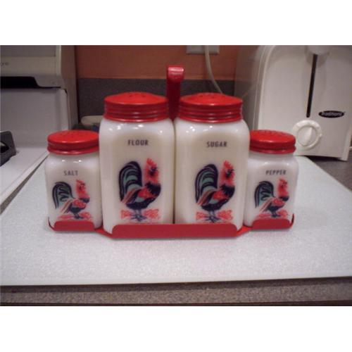This is a set of milk glass jars that have been refurbished. The jars and tops are old. These are not reproduction jars or tops. No chips or cracks are noted. The tops have been repainted with a good job being done. There is very slight paint wear. The decals are new and copied off the old Tipp City design. They are almost an exact replica. You have a salt, pepper, sugar, and flour shaker. The small ones are 3" tall and 1.75" square. The large ones are4.5" tall and 2.25" square. The holes are all good. The stand is also old and has been repainted. This is a great set for any kitchen decor.